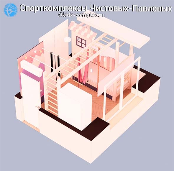Итак, байка. Приходит человек. Говорит: "Девочке 3 года, любит розовое и радугу. Хотим комплекс!" В комнате нужна только кровать. Потом правда оказалось, что еще шкаф и этажерка для книжек, но и они поместились с легкостью (чего не сделаешь, если люди хорошие). Ну так вот, на комплексе должны были быть: рукоход, шведская стенка, скалодром, высокий турник, гамак, трапеция, кольца (не считая лиан-канатов). Еще бы, говорят, гнездо. Так бывает? Мы посмотрели на комнату, и поняли, что бывает https://skfb.ly/p8E8Y Все, кроме гнезда. В общем-то, и гнездо бы поместилось, но комната невысокая (потолок 2610 мм). Поскольку все равно нужна кровать, то можно встроить домик над кроватью вместо низкого гнезда. А балки поднять под потолок и будет счатье до подрасткового возраста. И громоздко не будет - стоек, кроме тех, что у кровати, больше нету. По уголкам эффективно поместился шкаф и книжки. Спасло то, что не потребовалось еще и письменного стола.