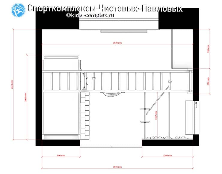 Джунгли в свободной зоне. Несмотря на обилие снарядов для лазанья они не смотрятся громоздко. При необходимости сняряды закидываются нверх за пару минут и комната свободна.