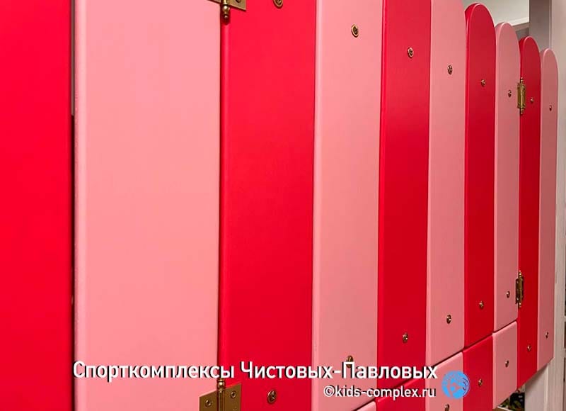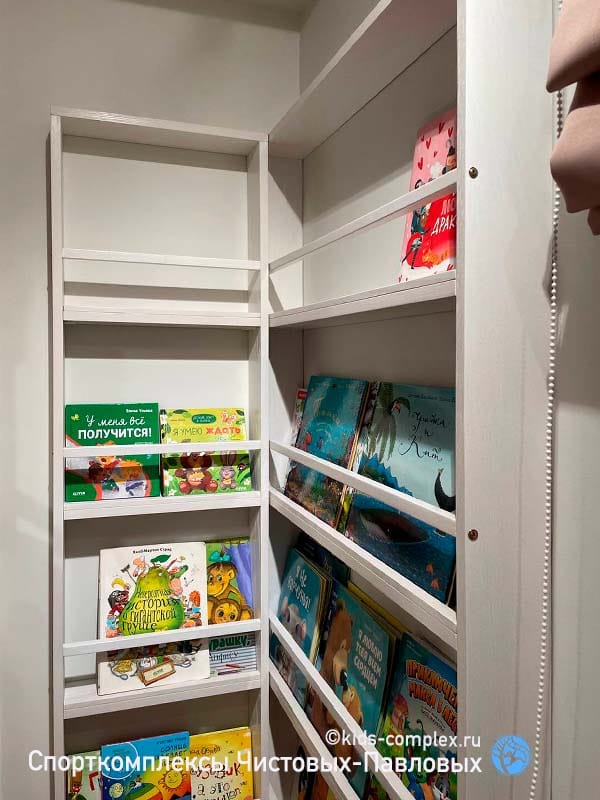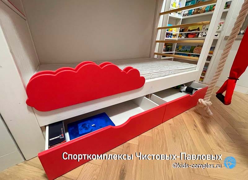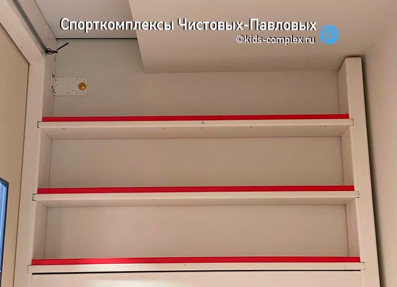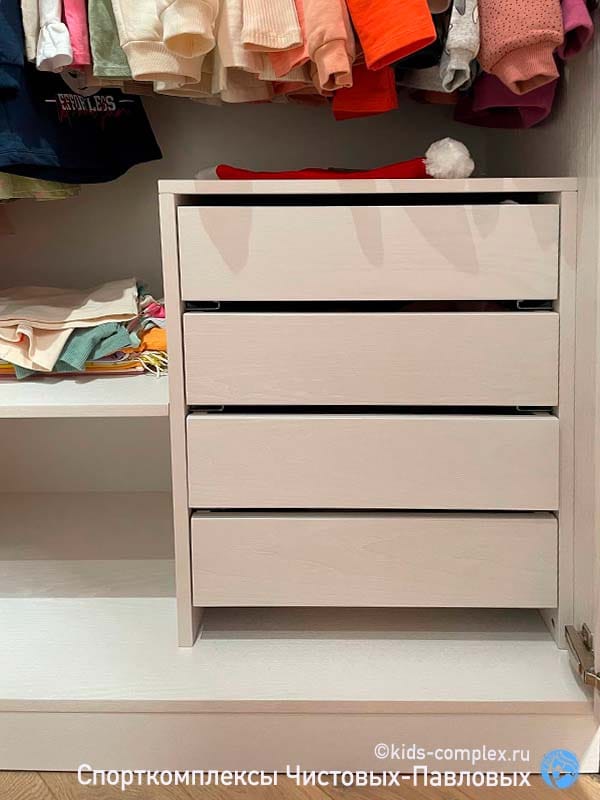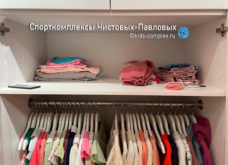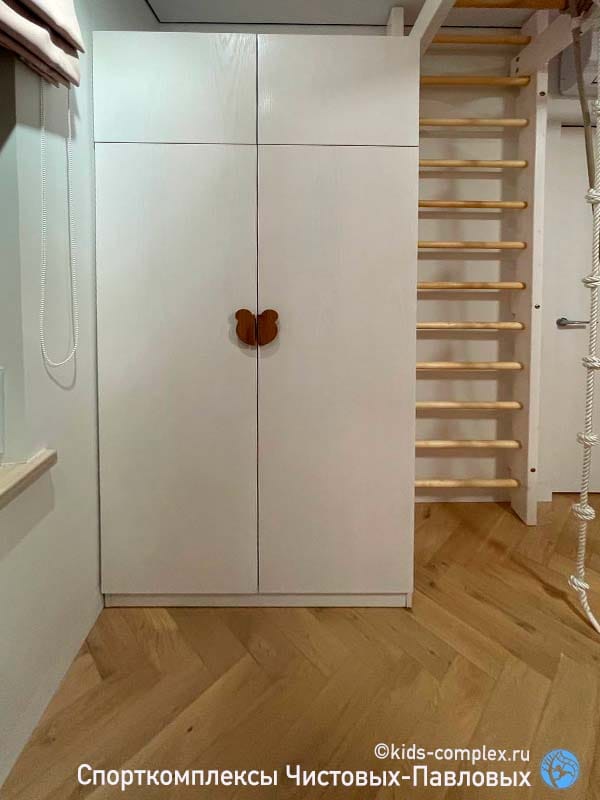 Шкаф рядом с зоной лазанья. Очень вместительный, покрывающий все потребности ребенка. При этом он сделан в тех размерах и в той зоне, где он абсолютно не мешает жизни и лазанью.