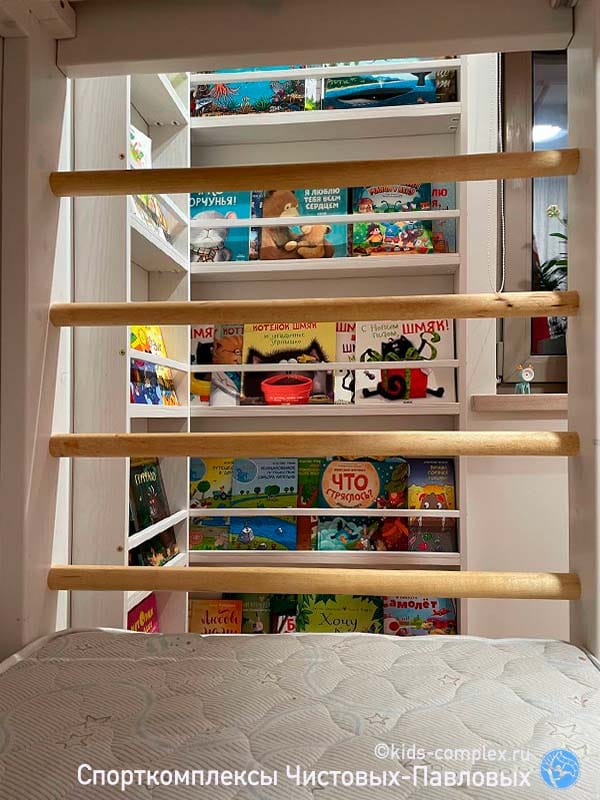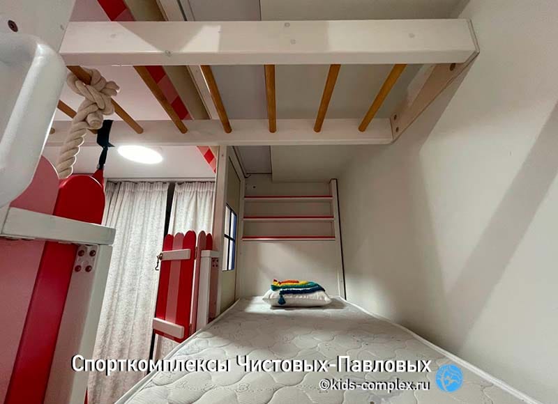 А это мир на втором этаже (в домике). Обратите внимание, высоты так рассчитаны, чтобы ребенку не было низко даже в зоне рукохода. Если же сюда поднимется взрослый, он сможешь и сесть в полный рост, и опереться спиной на изголовье - как и на первом этаже, оно имеет глухую часть для опоры спины и полочки для личных вещей с верху.