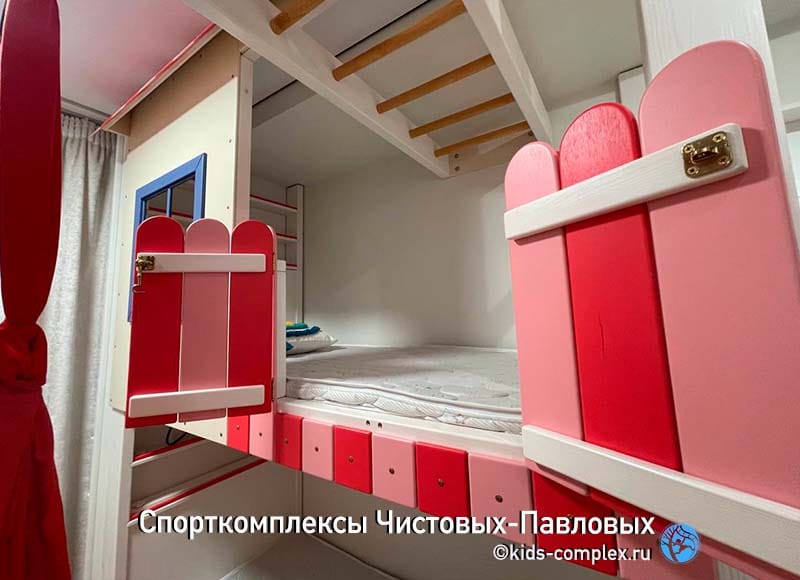 Кровать-домик двухэтажная. Домик занимает половину второго этажа. Вторая половина - заборчик, имеет открывающийся лаз на рукоход.