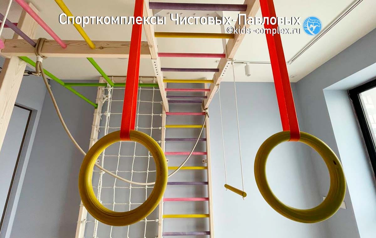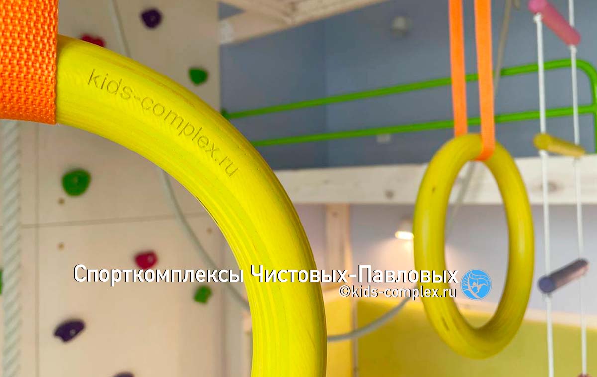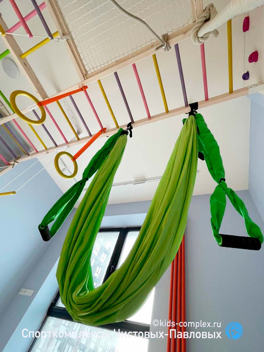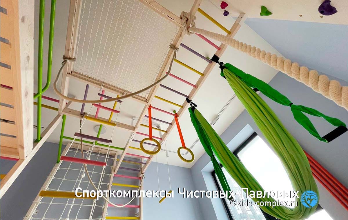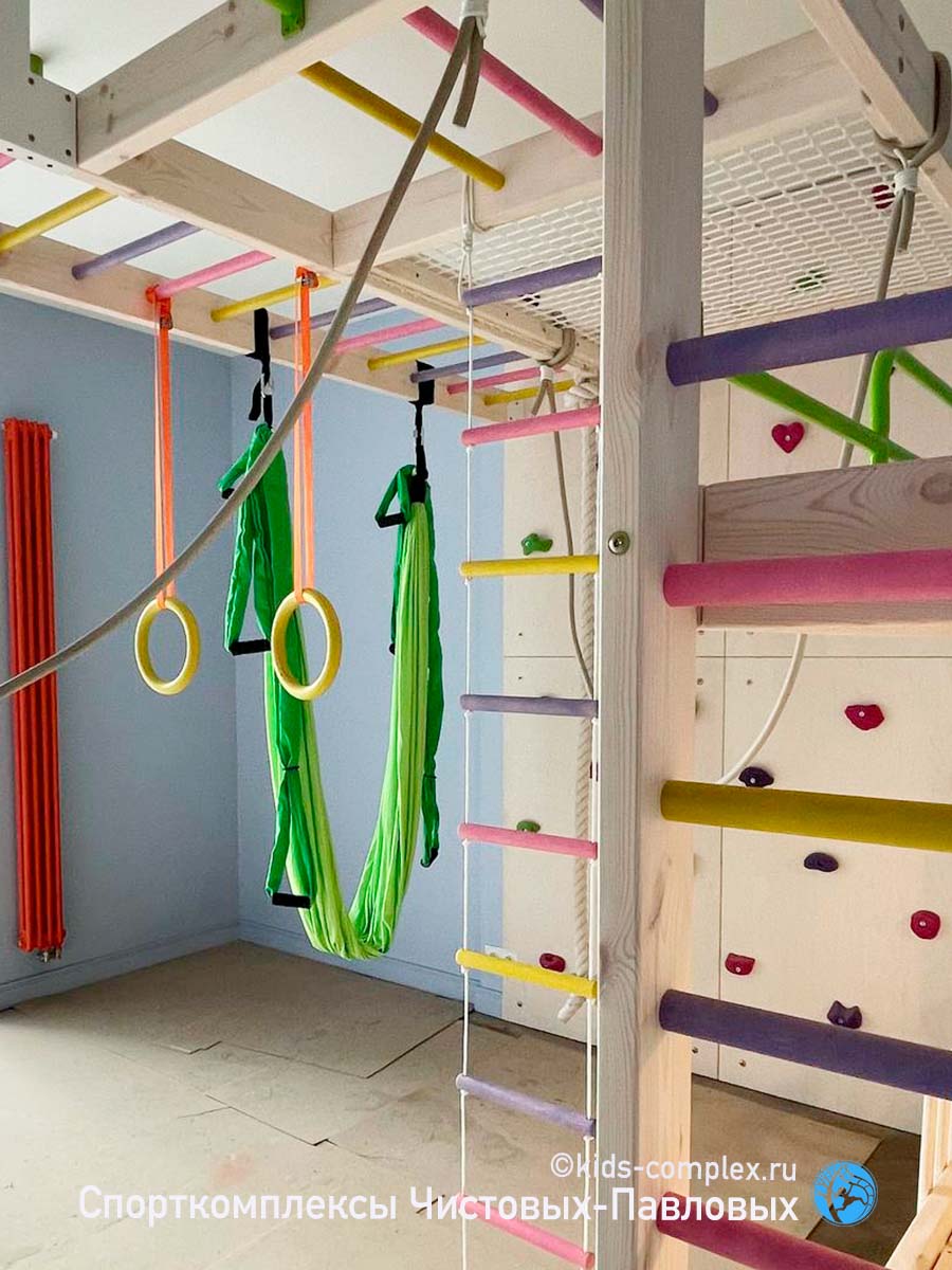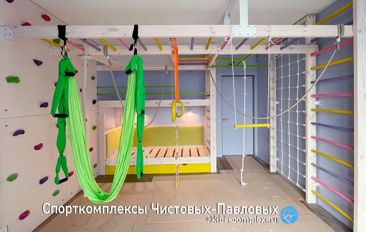 (1) Семьей было принято решение оставить максимально высокий потолок, здесь 2820 мм - высота не была потеряна. Эти сантиметры очень скажутся через несколько лет, когда ребенок станет подрастать. На самом деле с учетом гнезда они важны уже сейчас. (2) Длинный рукоход - 3660 мм. Больше, чем во многих спортивных залов. На очень хорошей высоте. После того, как ребенок научится его проходить (а это произойдет в ближайшие год-два) он станет одним из любимых и наиболее применимых снарядов и будет служить вплоть до взрослого возраста. (3) Большой скалодром. В домашнем формате построен просто в идеальном возрасте. Прямо сейчас ребенок сможет по нему лазить и попадать в гнездо. Чуть позже - усложнить зацепы (как минимум - повернуть сложной стороной) и заниматься функциональной тренировкой. Йога-гамак, шведская стенка, высокий турник и большие кольца - снаряды, которые уже сейчас смогут работать и для ребенка, и для мамы (и для папы, если он занимается). Тут есть где вывеситься, растянуться, сделать подтягивания и многое другое. Посмотрите - в спортивной зоне для этого совершенно не тесно. Ну и, конечно, есть специфические снаряды для малыша - трапеция, матросская лесенка, канаты, лиана. Эти снаряды позволят внедрить методологию Чистовых-Павловых, создавая возможность вариативного лазанья (вспомните любимую детьми игру "Пол - это лава!") и переходов.