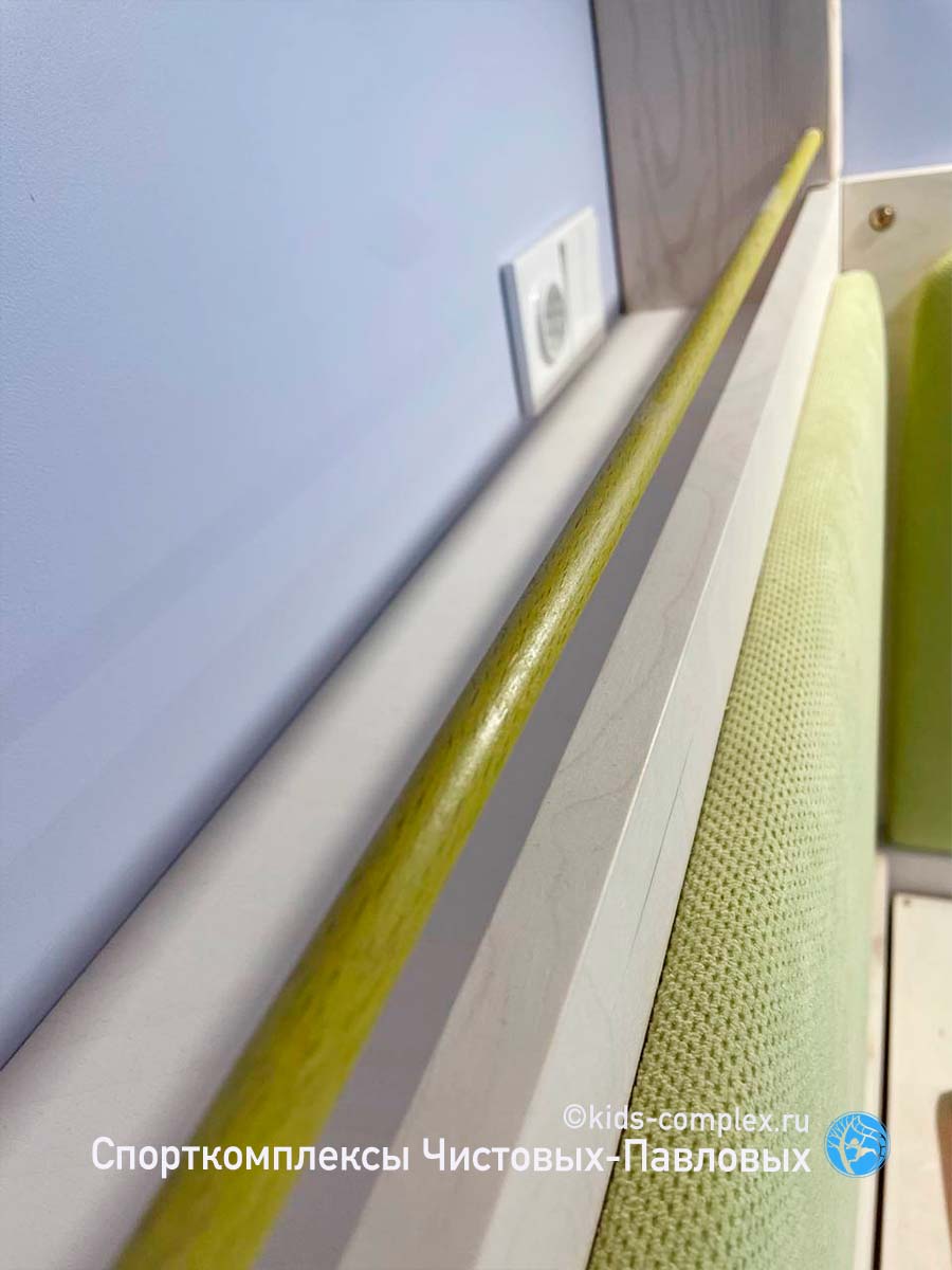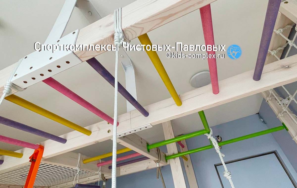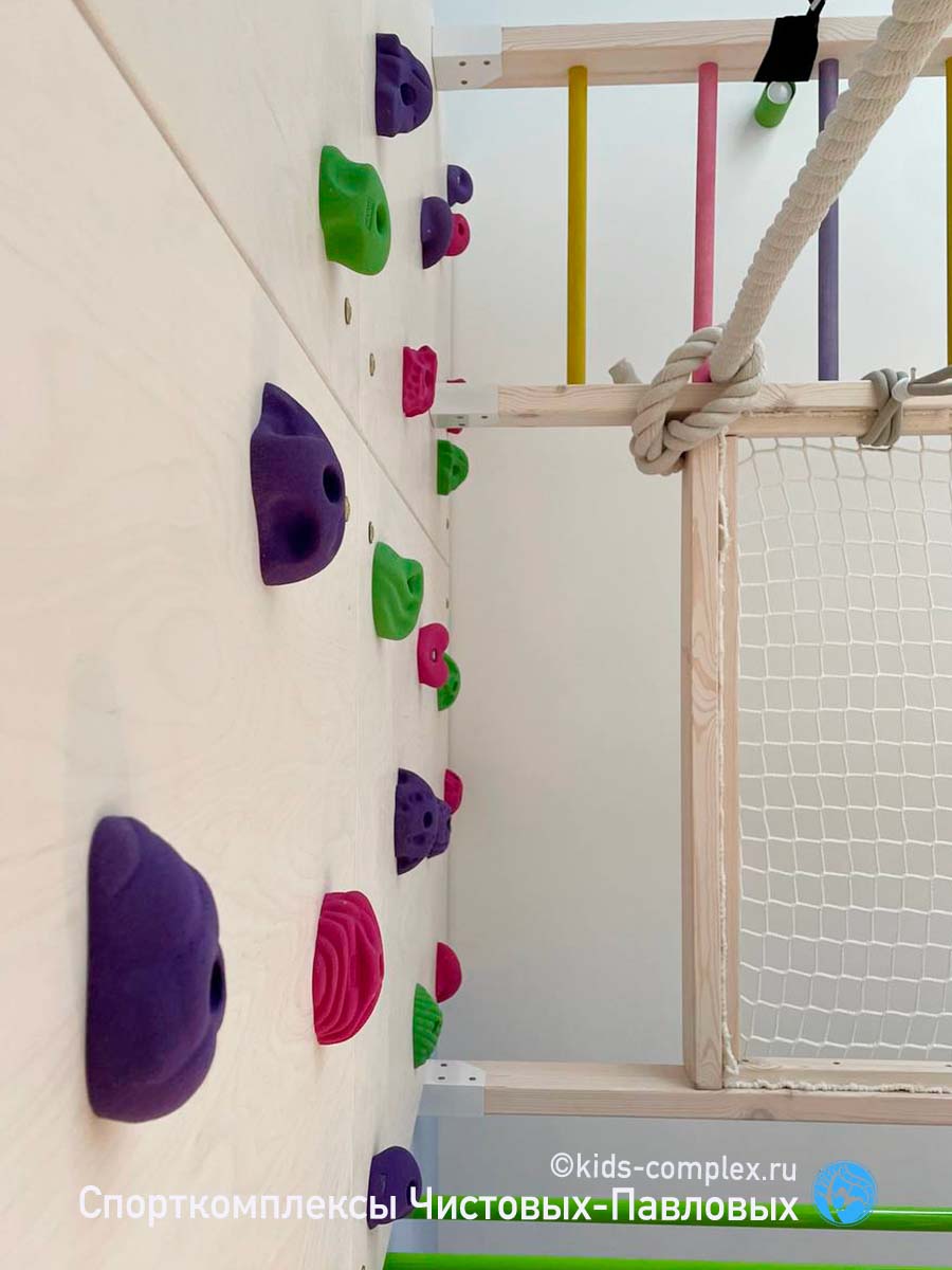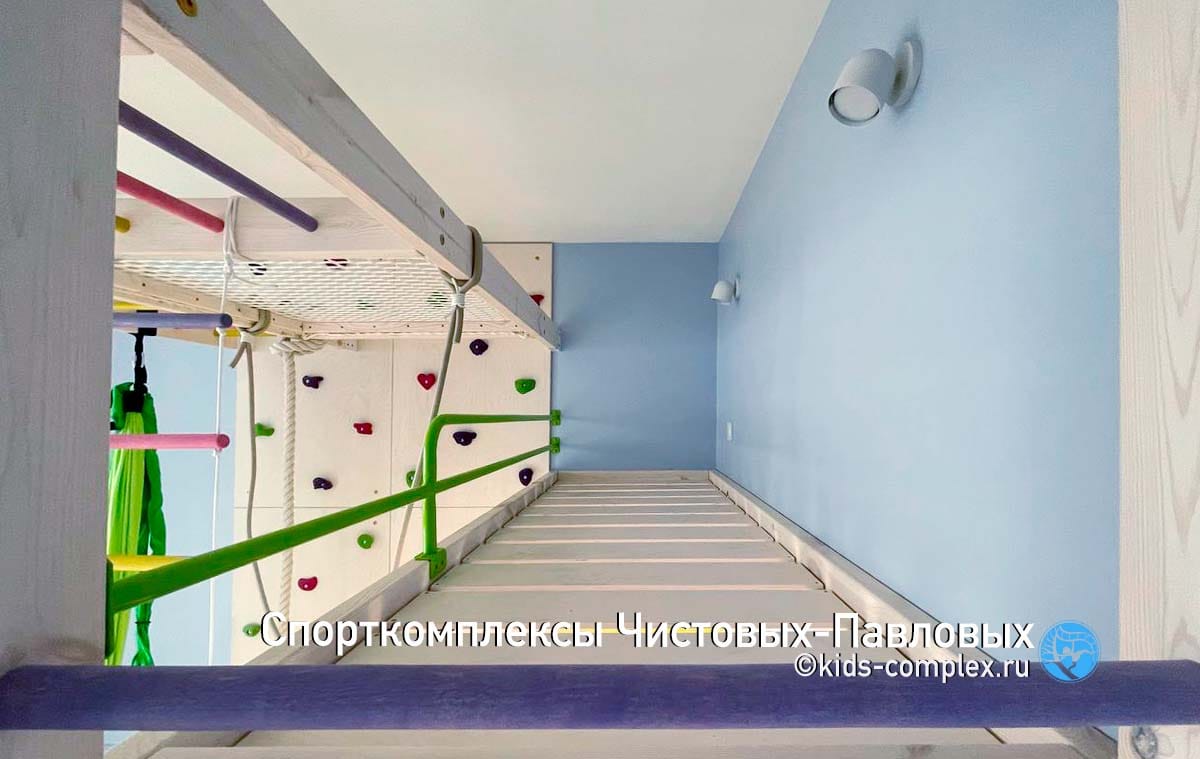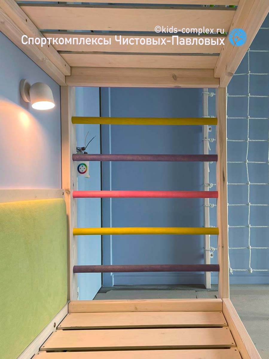 Но отвлечемся от кроватки. Все это затевалось еще и для того, чтобы создать в комнате сенсорную зону (зону лазанья) достаточную для детей (одного или нескольких) на многие годы. Сейчас ребенку 5 лет. Но здесь все сделано так, чтобы лазить (а позднее - заниматься спортом) он мог в этой зоне как минимум до подросткового возраста (а то и позже). Что это обеспечивает?