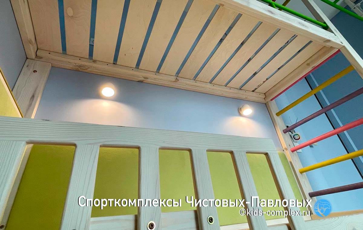 Планировалось, что на первом этаже ребенок будет спать, на втором - играть. Чтобы играть было удобно, в домике тоже используют невысокий матрасик (рекомендуемая высота матраса около 90 мм, выступ матраса над каркасом - 50 мм). Можно использовать матрасик и выше, здесь главное не создать эффект второй полки вагона. Даже взрослый человек, котором захочется сесть наверху и почитать ребенку книжку, например, не должен касаться головой потолка. По нашим замерам взрослому человеку 185 см ростом нужно минимум 90 см между матрасиком и потолком, чтобы не требовалось нагибать голову. Значит все, что выше 90 см будет для второго этажа приемлемо. Далее - подсветка. Ее решают по разному. Кто-то предпочитает свет в изголовье, кто-то - по периметру. Мы (как и заказчица этого проекта) считаем самым удобным направленный боковой свет. Он не стесняет изголовье и может быть направлен напрямую на книгу. Или наоборот, если счета хочется меньше, его можно отвернуть от человека или наверх и он окажется смягчен. Здесь решение сделано в пользу обоих этажей - два светильника снизу и два сверху. Включаются раздельно. Обратите внимание, в любой из зон может быть уютно и удобно.