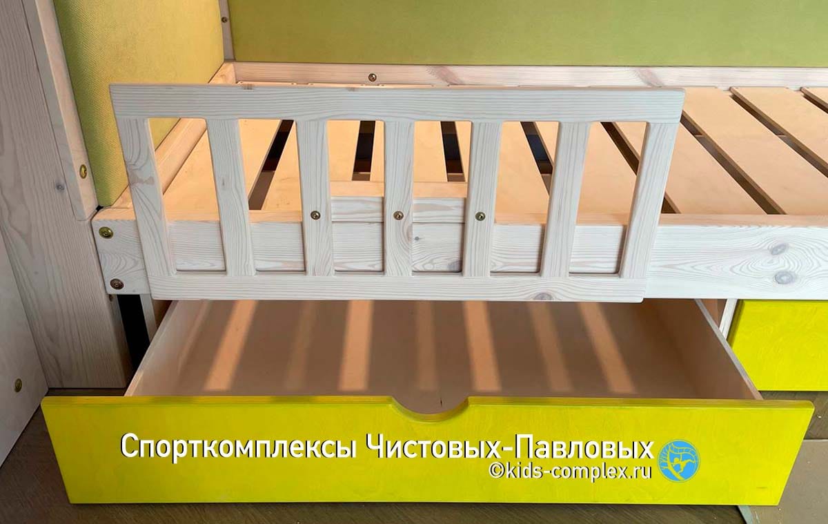 Следующая особенность именно этой кроватки - мягкое изголовье и спинка. Это дальновидно. Дело не только в сидении, ведь посадку можно смягчить подушками. Но стены в зоне кровати обычно довольно быстро протираются. Мебельное покрытие, рассчитанное на трение, естественно прослужит дольше. Еще одна практичная деталь - полочка в изголовье. Сделана так, чтобы не выступать над головой (не портить осанку). Не знаю как у вас - у нас часто возникает ситуация, когда хочется ее использовать. Можно посадить на нее игрушку, поставить чашку, положить телефон или поставить книжку. Чтобы то, что поставлено на полочку, не оказалось в кровати, полочка имеет бортик. Логично? Отдельная история про электрику в кровати. Здесь по высоте полочки была запланирована и сделана розетка. Можно по-разному смотреть на розетки в кроватях. Для кого-то они удобны, для кого-то неуместны. Лично у нас в доме такие тоже есть и они регулярно выручают в повседневной жизни. Например, хочется почитать ребенку на ночь в кровати сказку с телефона и забыли зарядить телефон. В общем, у нас тоже есть. А вот то, что при этом телефон можно положить на полочку, а не рядом с изголовьем - удобно. Но это еще не все хитрости этой чудо-кроватки и домика. Поехали дальше. Ограждение второго этажа и лаз в гнездо. Ограждения мы делаем абсолютно любыми - из металла, дерева, фигурные, с аппликациями. Здесь выбран элемент практичный. За металл можно схватиться. Через него можно перелезть. На него можно наступить и "сигануть" в гнездо сразу из домика. А можно - на скалодром, рукоход, лесенку. Домик становится постоянной точкой притяжения разных маршрутов лазанья. Хорошо ли это для игровой зоны? Мы считаем, что просто великолепно. Иное решение сделано в отношении ограждения первого этажа. Оно может быть очень временным. Для подросших детей его лучше не иметь, ведь они вместе с друзьями могут использовать кровать первого этажа в качестве дивана. Для маленького ребенка идеально, если ограждение первого этажа будет съемным. Здесь так и есть. Наконец, ящики. Ящики под кроватью, если их сделать максимальной глубины и ширины, становятся очень практичной вещью. Один такой ящик вмещает все постельное белье, если его хочется убрать на день, а не хранить на кровати. Второй - сменное постельное белье или не сезонную одежду. Или много игрушек. Мы обсуждаем очень тщательно с каждой семьей какие именно им ящики нужны - выкатные или выдвижные. Здесь они выкатные. Их можно сделать удобными, для этого внутри для каждого ящика делается отдельное посадочное место с направляющими (колесиками), направляющими ящик и не дающими ему биться о стенки кровати. При этом условии выкатные ящики удобны и взрослому и ребенку, особенно когда он подрастет. Таким образом, любая кроватка - это набор разных решений и хитростей. Все, от высот и полочек до хранения и степени встроенности, определяется особенностями дома, ребёнка и уклада семьи. Здорово, когда по каждой опции есть возможность сделать осознанный выбор.