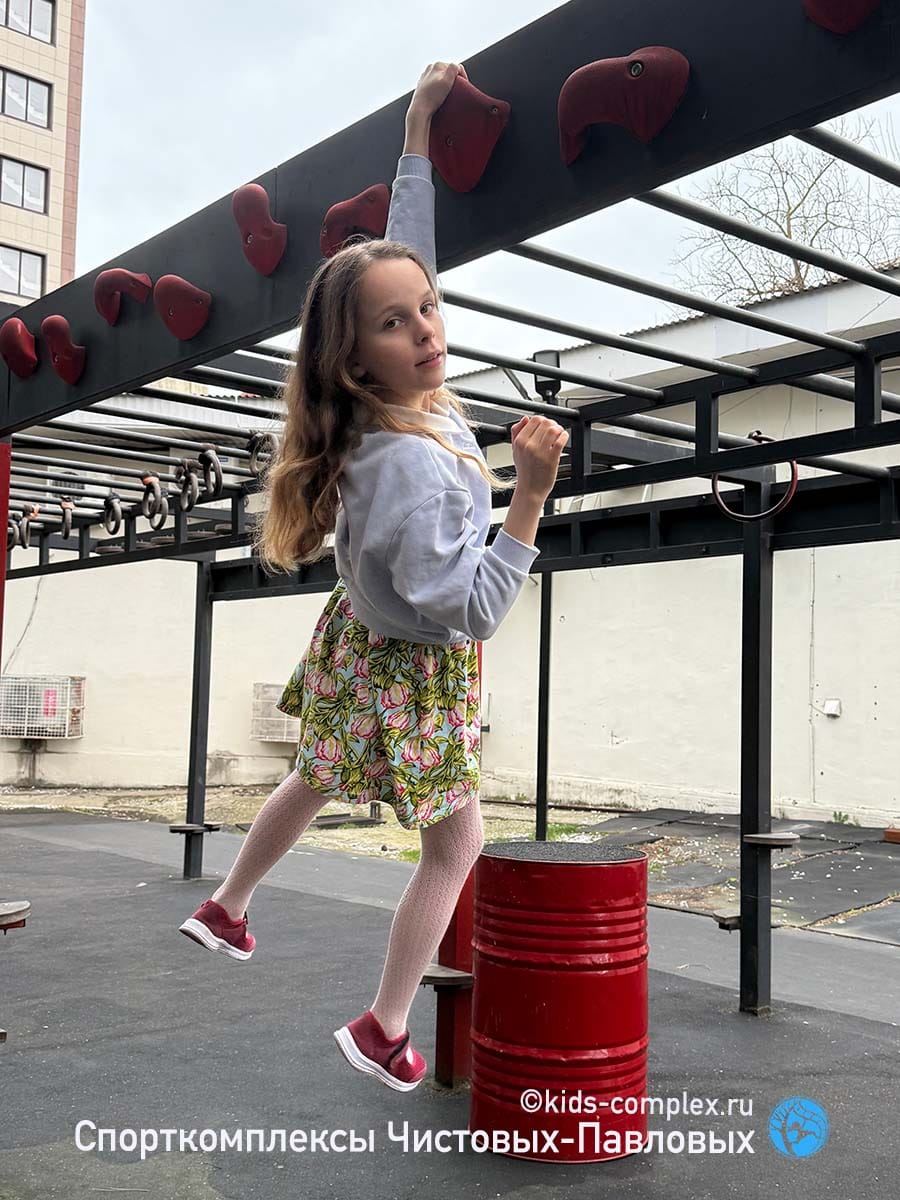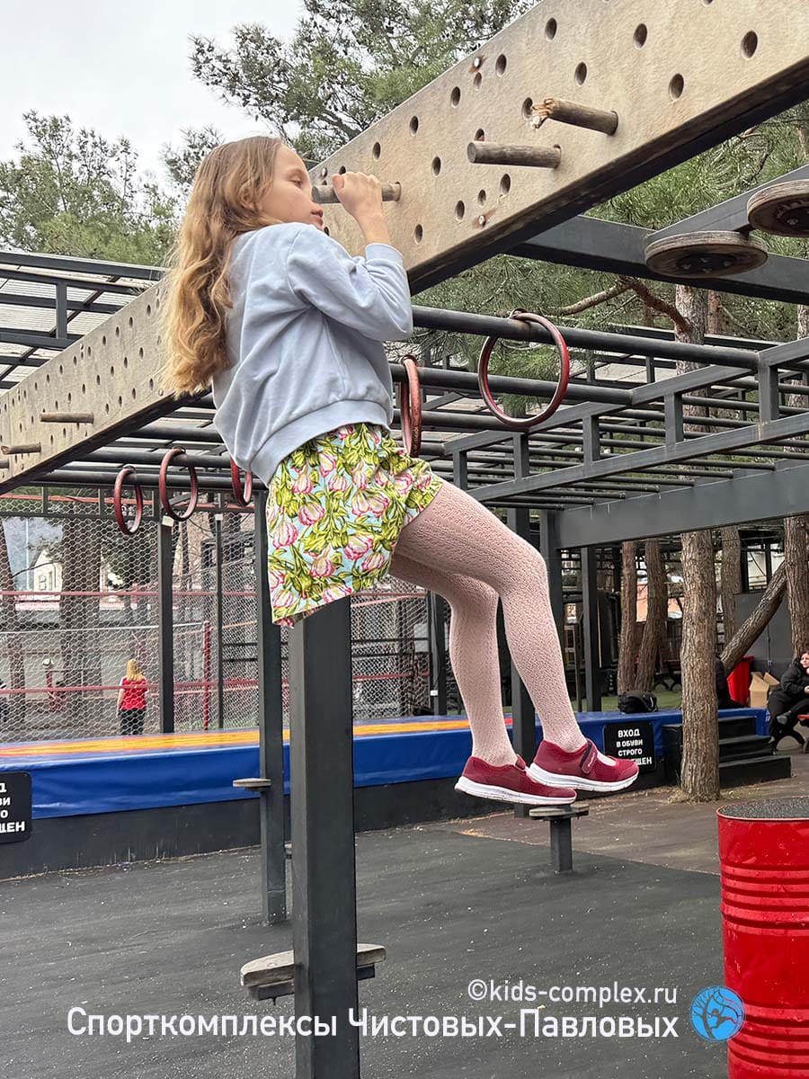 Здесь полоса около 10 метров. Подходящий для детей заход только один - по центру. Площадки на крайних столбах сделаны так, что по росту ребенок не достанет с них до пегборда. Это неудачно, дети все равно залазят, но у них нет сквозной трассы. В данном случае есть заход, но нет спуска - у ответного столба, даже если бы Никита дошел до конца, ему было бы не спуститься - только соскок. В уличном ниндзя-парке за несколько лет многие штыри распухли и не выходят из отверстий, требуется регулярно проверять штыри и проводить техобслуживание, если сняряд используется на улице. Снаряд заинтриговал, понравился, оставил благоприятное впечатление. Является универсальным (подходит для разных видов спорта). Будем внедрять.