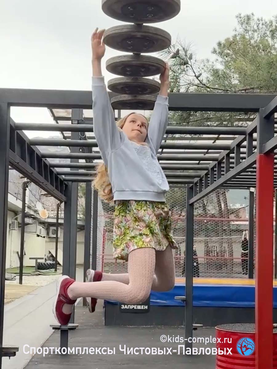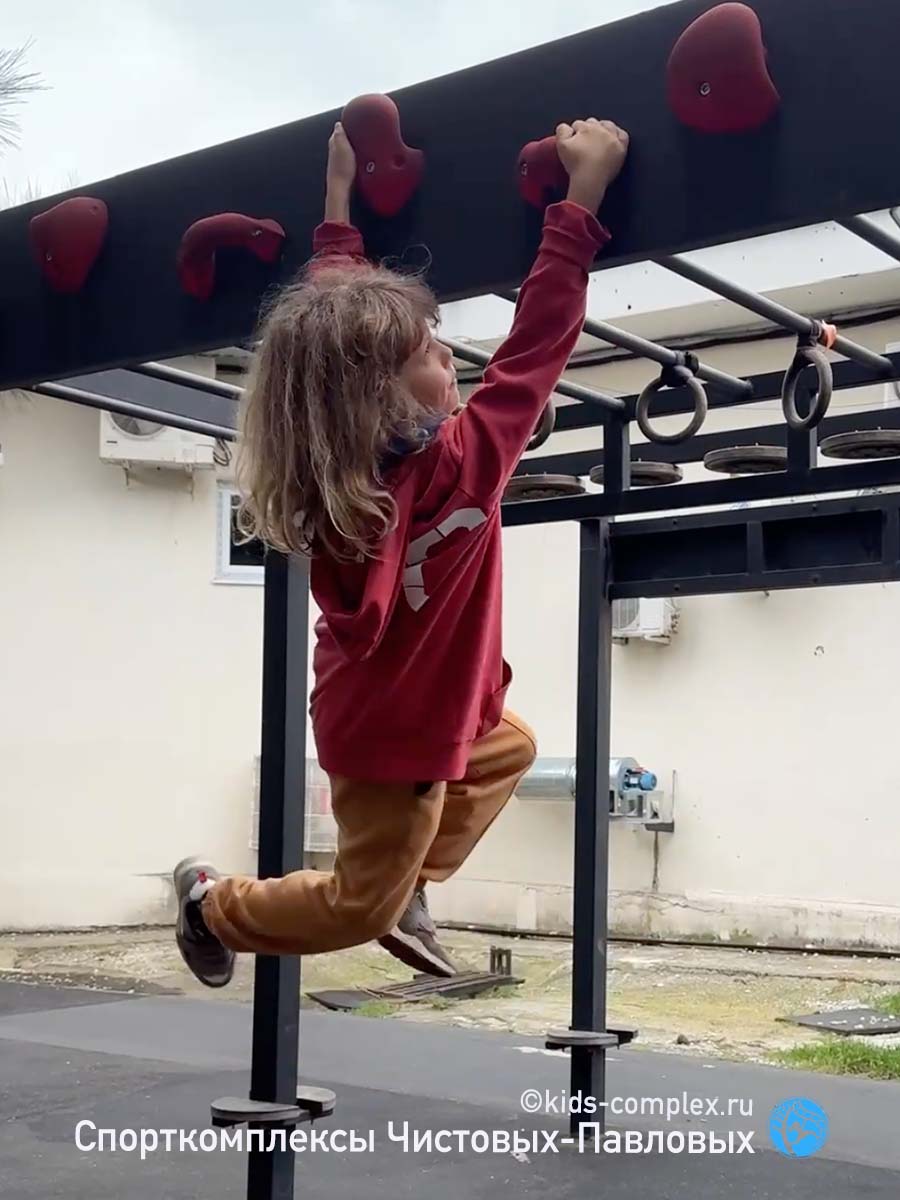 Длинная горизонтальная линия с перфорацией пегборда - в данном случае не менее 10 метров. Во взрослых ниндзя-зонах поднята на взрослую высоту. Это снаряд, который на такой длине пройти очень сложно и требуется соскок, так что в домашних спортивных комплексов нужно его адаптировать (по высоте, лазу (способу забраться на начальную позицию) и соскоку (здесь мат вполне уместен, либо нижний уровень должен быть чуть выше роста ребенка). Пегборд универсален, много применим (развиваемые группы мышц универсально востребованные в разных видах спорта). Мы оценивали его как подростковый снаряд, но практика показала, что его можно и нужно вводить раньше. Здесь - лазанье показывают Никита 8 лет и Забава 12 лет. Для тех, кто занимается в скалолазных секциях, может быть полезно на пегборде подтягиваться.