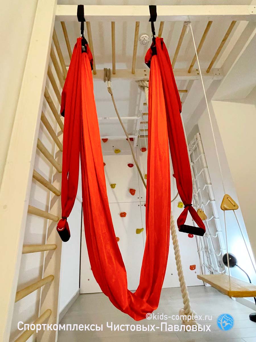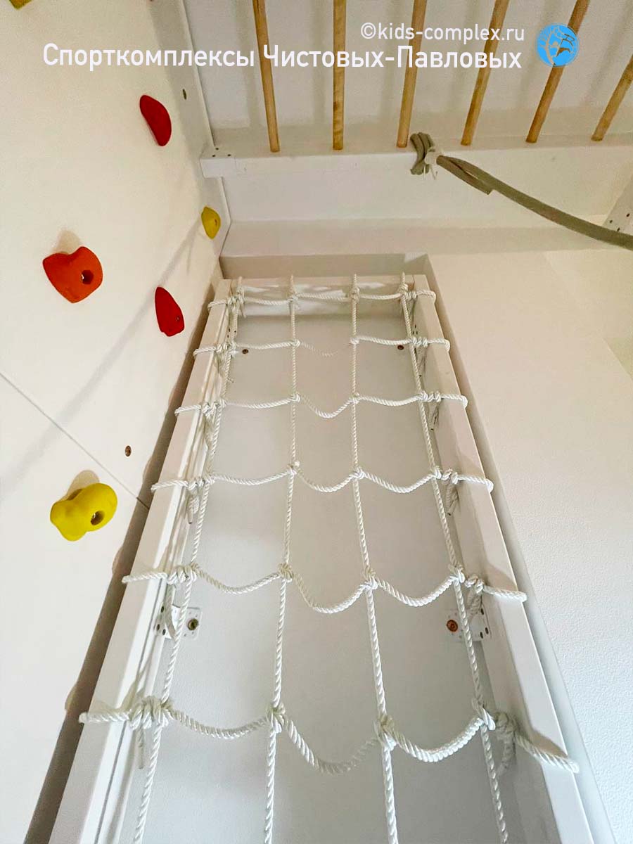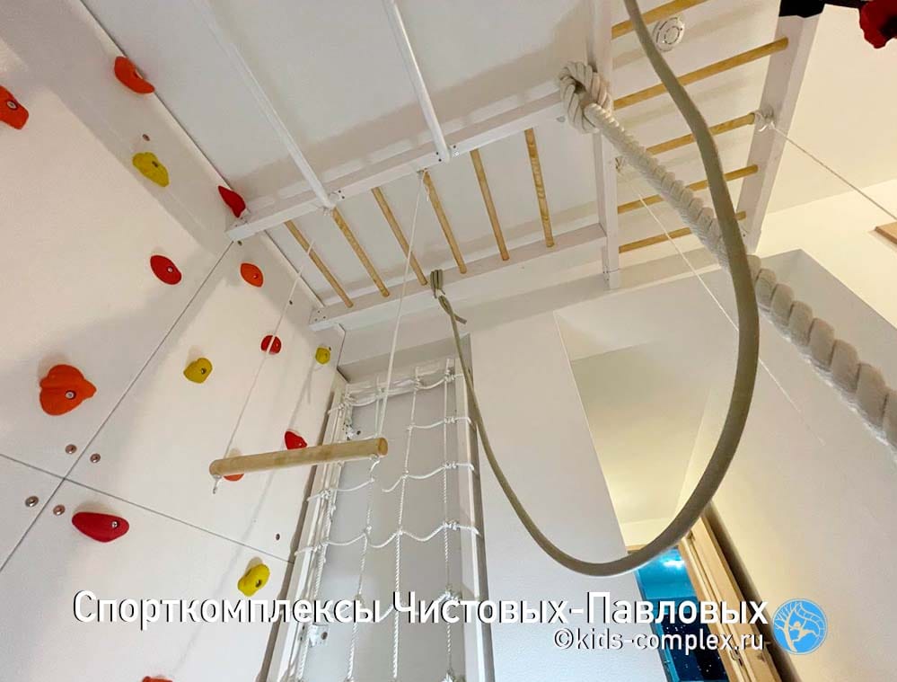 Второй недостаток коридоров связан с тем, что по ним вы будете постоянно ходить. В конце концов в детской гоняют только дети, а для них высоты снарядов воспринимаются совсем по другому. Если кольца или трапеция висят для ребенка на расстоянии вытянутой руки, то взрослому оно придется на уровень груди или головы, в общем, вероятность поймать в темноте кольцом по лбу, когда вы ночью пошли в туалет, все-таки присутствует. Поэтому нужна заведомая лояльность взрослых членов семьи этому проекту. Потому что ходить-то там взрослым. Глобальной беды не произойдет: комплексы Чистовых-Павловых подразмевают, что стоек по середине как правило нет и все, что висит, можно закинуть наверх (в гнездо или на рукоход) и освободить проход полностью. Кольца заткнуть за ступень шведской стенки. Мягкие снаряды (канат, лиана) шишку никому не набьют. Вот и балансируем. Вешаем то, что может качаться так, чтобы оно не мешало проходу или легко убиралось в сторону. Смотрим, чтобы двери открывались мимо траектории работы снаряда. Иногда, наоборот, вешаем снаряды так, чтобы они могли качаться в проем или открытую дверь (если это дверь детской, а не туалета, естественно). Вот такой баланс интересов. Третий недостаток связан с тем, что в коридоре как правило нет сидячего места для родителей. А дети очень любят взрослых теребить: "Мама, посмотри как я лажу!" Это, конечно, решается, если в гостинную ведет открытый проем или арка, или хотя бы если есть какой-то диван в зоне видимости в одной из смежных полок. Или мягкая подушка с шариками, которую сюда можно будет притащить. И в любом случае, комплекс в коридоре сработает. Посмотрите, например, здесь: кресло-гамак, кольца, трапеция, лиана, лесенка Скрипалева, канат. Шведская стенка, рукоход, большой скалодром, турники, гладиаторская сетка. Пусть в небольшом объеме, но все функционально. И это много, много, много лучше, чем ничего. Любой, даже лаконичный комплекс даст ребенку целый мир.