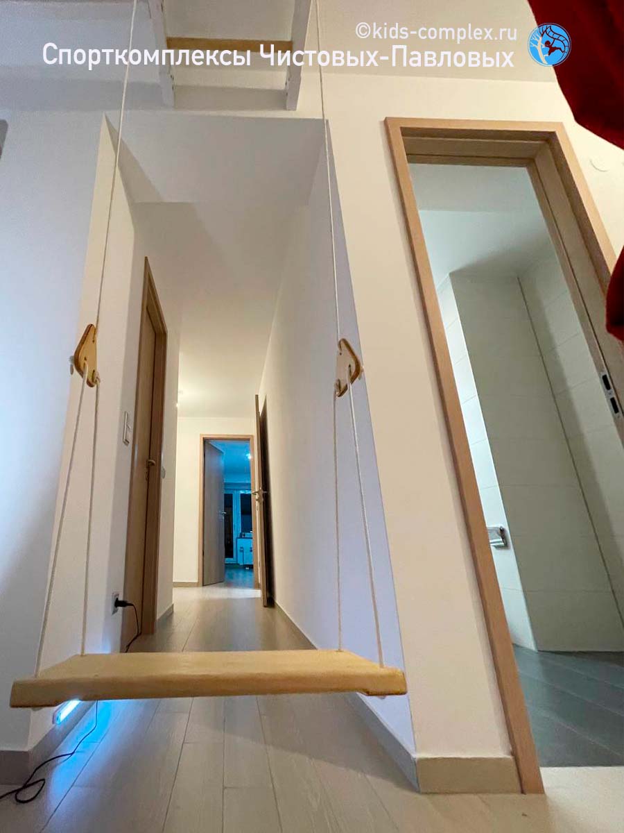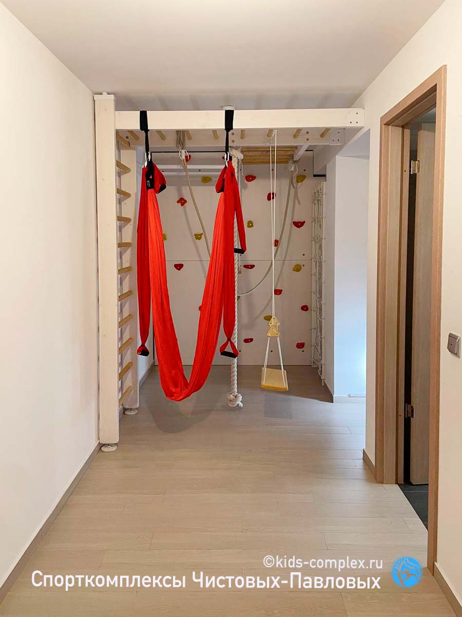 Не останавливайтесь, если у ваших детей для лазанья только коридор. Но не упрощайте свою задачу. Включите фантазию. Может быть удастся сделать систему с переходом из коридора в комнату. Может удастся в коридоре разместить гнездо. Но это - не главное. Главное задействовать длину коридора для амплитудно качаютсяхся снарядов и, даже если коридор длинный и узкий, придумать как вывести лазанье из линии. Задача выглядит сложной, но обычно ее удается решить. Помните, ваша шведская стенка или рукоход в коридоре станет живым, если по нему есть куда залазить, есть куда переходить, если висит хотя бы что-то, на чем можно качаться. Но даже если вы просто повесите ребенку в коридоре кольца на турнике или йога-гамак, это лучше, чем ничего раскачивающегося совсем не иметь. В конечном счете комплекс в детской, конечно, удобнее. Просто потому что он не будет попадатся под руку и висеть на уровне лица у взрослых людей и взрослых гостей. То есть при прочих равных мы бы предложили убрать из детской (в коридор) шкаф, а комплекс сделать в комнате. Но, если так почему-то нельзья, то используйте ваш коридор.