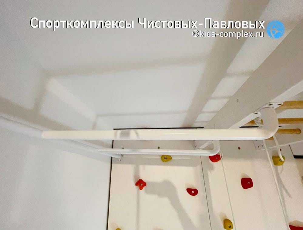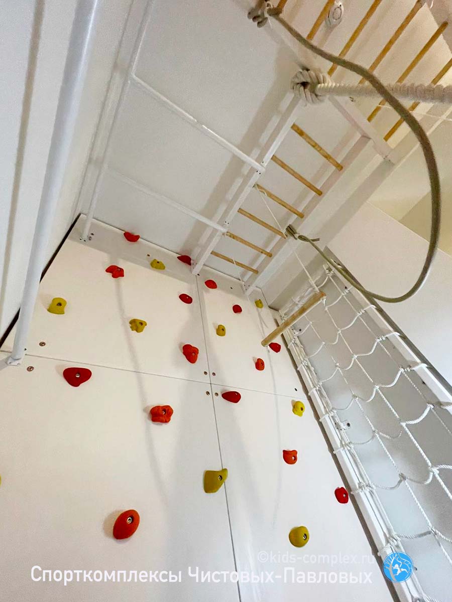 Здесь два больших скалодрома, один из них имеет лаз в гнездо. Второй работает до потолка с переходом по турнику в зону рукохода. Рукоход 2255 мм - хорошей длины. Две шведских стенки, есть куда приставить горку и навесить брусья. Рабочая зона для гладиаторской сети. Удобное место для требовательной к пространству лесенки Скрипалева. Комплекс явно удался.