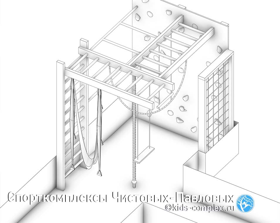 Этот комплекс начался с запроса разместить лазанье в небольшом тупике в коридоре, примерно 1600х1700 мм размером, площадью 2.72 кв.м. Мы сразу увидели неизбежную необходимость расширения. Добавив комплексу буквально полметра можно было закончить его напротив примыкающего узкого и длинного прохода, что позволяло добавить раскачивающийся снаряд и вывести лазанье из линии. Далее мы отработали много нестандартных нюансов, подробно описали их в этой статье.