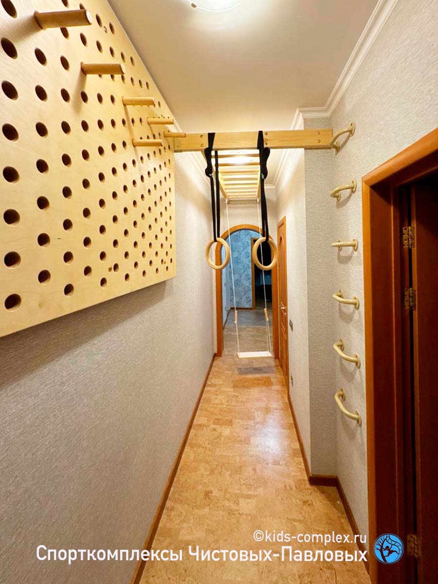 Есть еще одна история, которая очень нравится многим. Если в комнате места мало, можно вынести продолжение комплекса в коридор. В данном случае и не подразумевается, что в коридоре должен поместиться весь комплекс. Что там должен быть полный набор снарядов, что там будет основная часть лазанья. Скорее подразумевается, что двое-трое детей могут "поделить" зоны интересов или какой-то снаряд, не поместившийся в комнате, может в коридоре поработать. В общем, это идея что лазанье "расползается" из детской, но не локализуется в коридоре совсем.