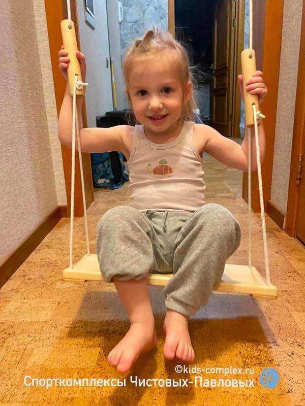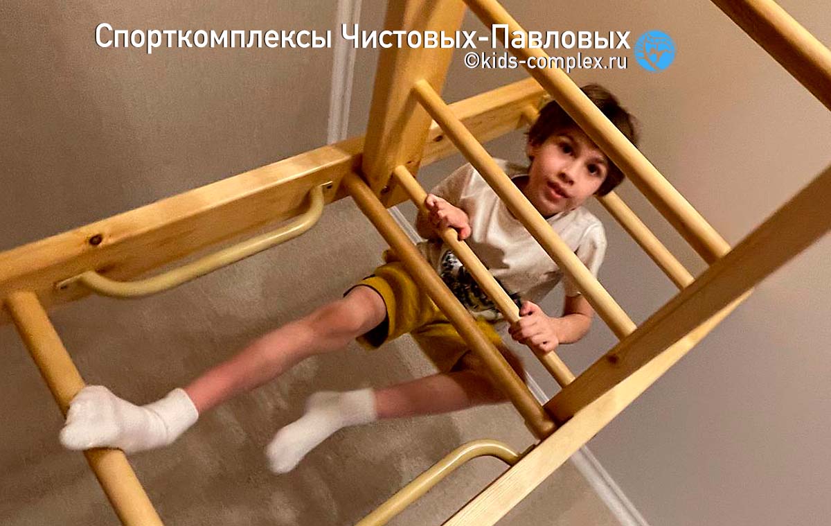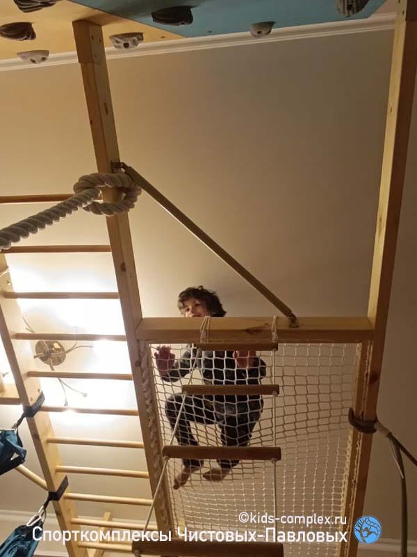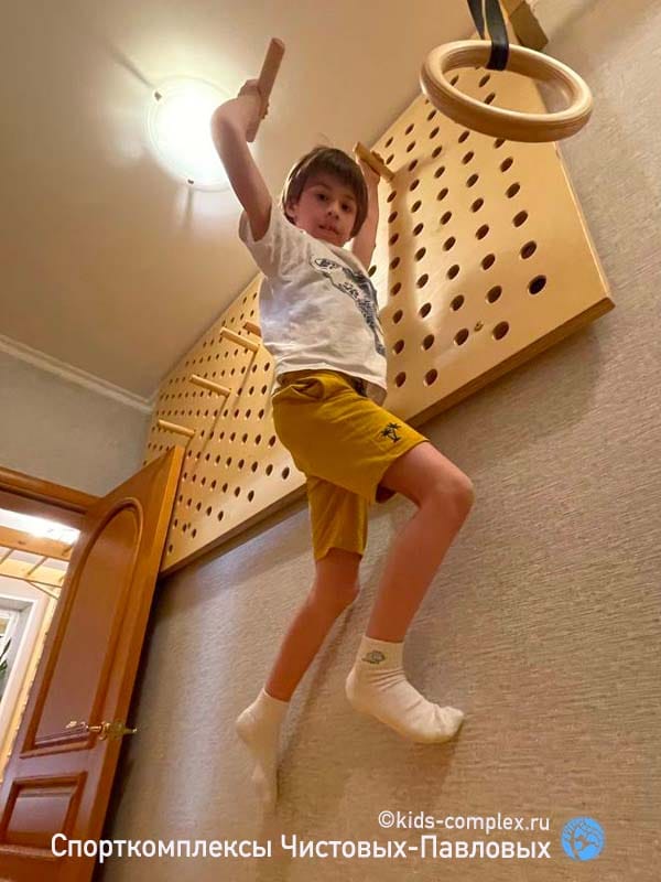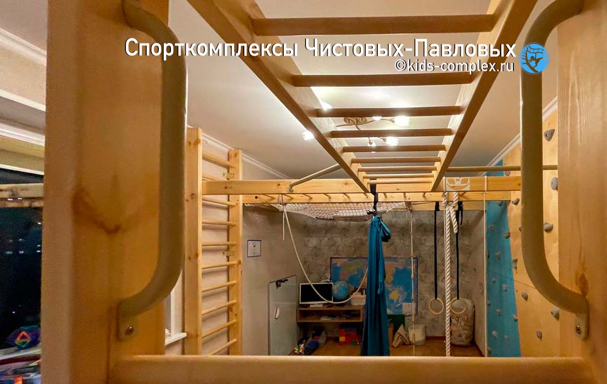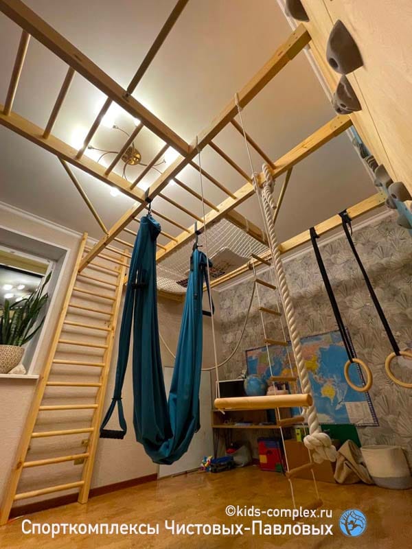 Второй недостаток коридоров связан с тем, что по ним вы будете постоянно ходить. В конце концов в детской гоняют только дети, а для них высоты снарядов воспринимаются совсем по другому. Если кольца или трапеция висят для ребенка на расстоянии вытянутой руки, то взрослому оно придется на уровень груди или головы, в общем, вероятность поймать в темноте кольцом по лбу, когда вы ночью пошли в туалет, все-таки присутствует. Поэтому нужна заведомая лояльность взрослых членов семьи этому проекту. Потому что ходить-то там взрослым. Глобальной беды не произойдет: комплексы Чистовых-Павловых подразмевают, что стоек по середине как правило нет и все, что висит, можно закинуть наверх (в гнездо или на рукоход) и освободить проход полностью. Кольца заткнуть за ступень шведской стенки. Мягкие снаряды (канат, лиана) шишку никому не набьют. Вот и балансируем. Вешаем то, что может качаться так, чтобы оно не мешало проходу или легко убиралось в сторону. Смотрим, чтобы двери открывались мимо траектории работы снаряда. Иногда, наоборот, вешаем снаряды так, чтобы они могли качаться в проем или открытую дверь (если это дверь детской, а не туалета, естественно). Вот такой баланс интересов. Третий недостаток связан с тем, что в коридоре как правило нет сидячего места для родителей. А дети очень любят взрослых теребить: "Мама, посмотри как я лажу!" Это, конечно, решается, если в гостинную ведет открытый проем или арка, или хотя бы если есть какой-то диван в зоне видимости в одной из смежных полок. Или мягкая подушка с шариками, которую сюда можно будет притащить. И в любом случае, комплекс в коридоре сработает. Посмотрите, например, здесь: кресло-гамак, кольца, трапеция, лиана, лесенка Скрипалева, канат. Шведская стенка, рукоход, большой скалодром, турники, гладиаторская сетка. Пусть в небольшом объеме, но все функционально. И это много, много, много лучше, чем ничего. Любой, даже лаконичный комплекс даст ребенку целый