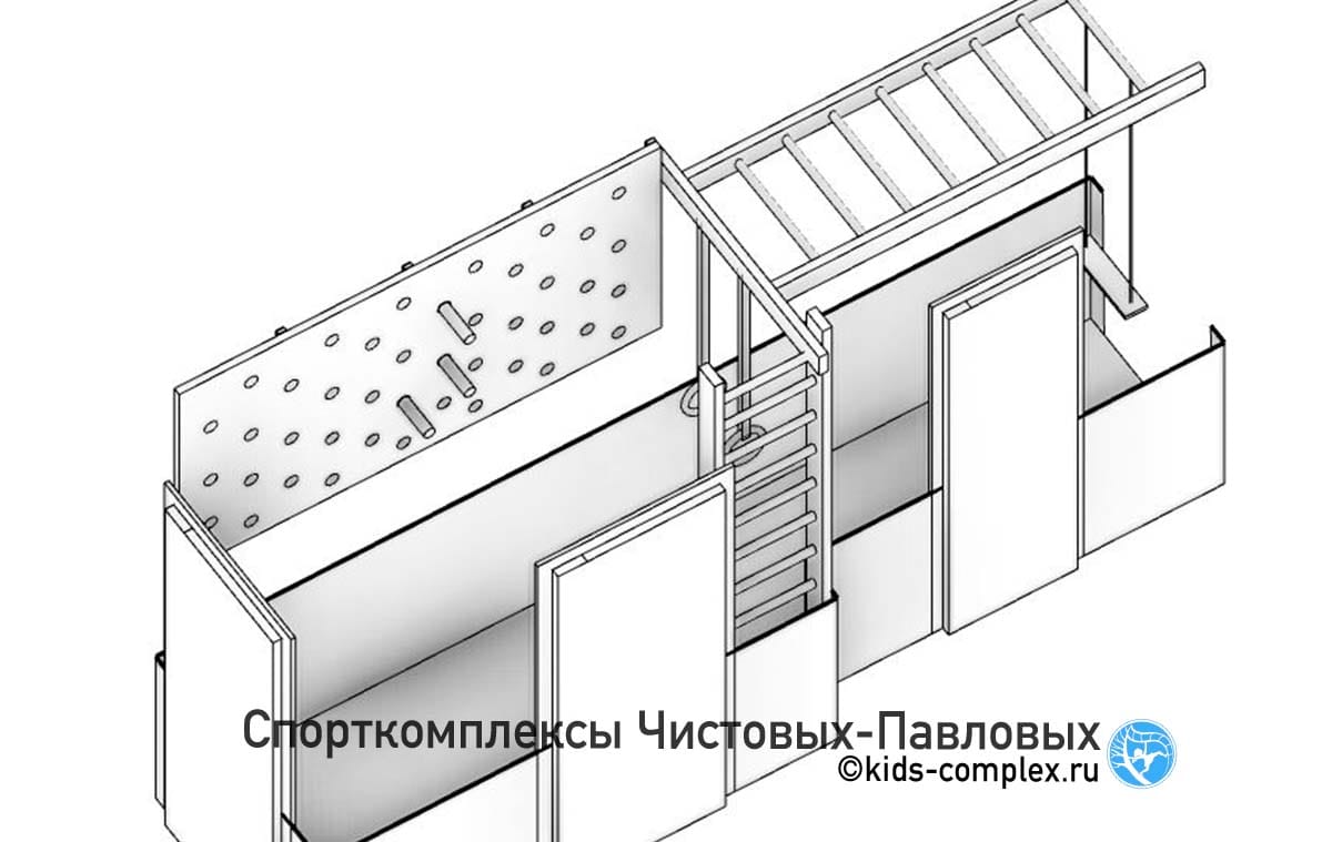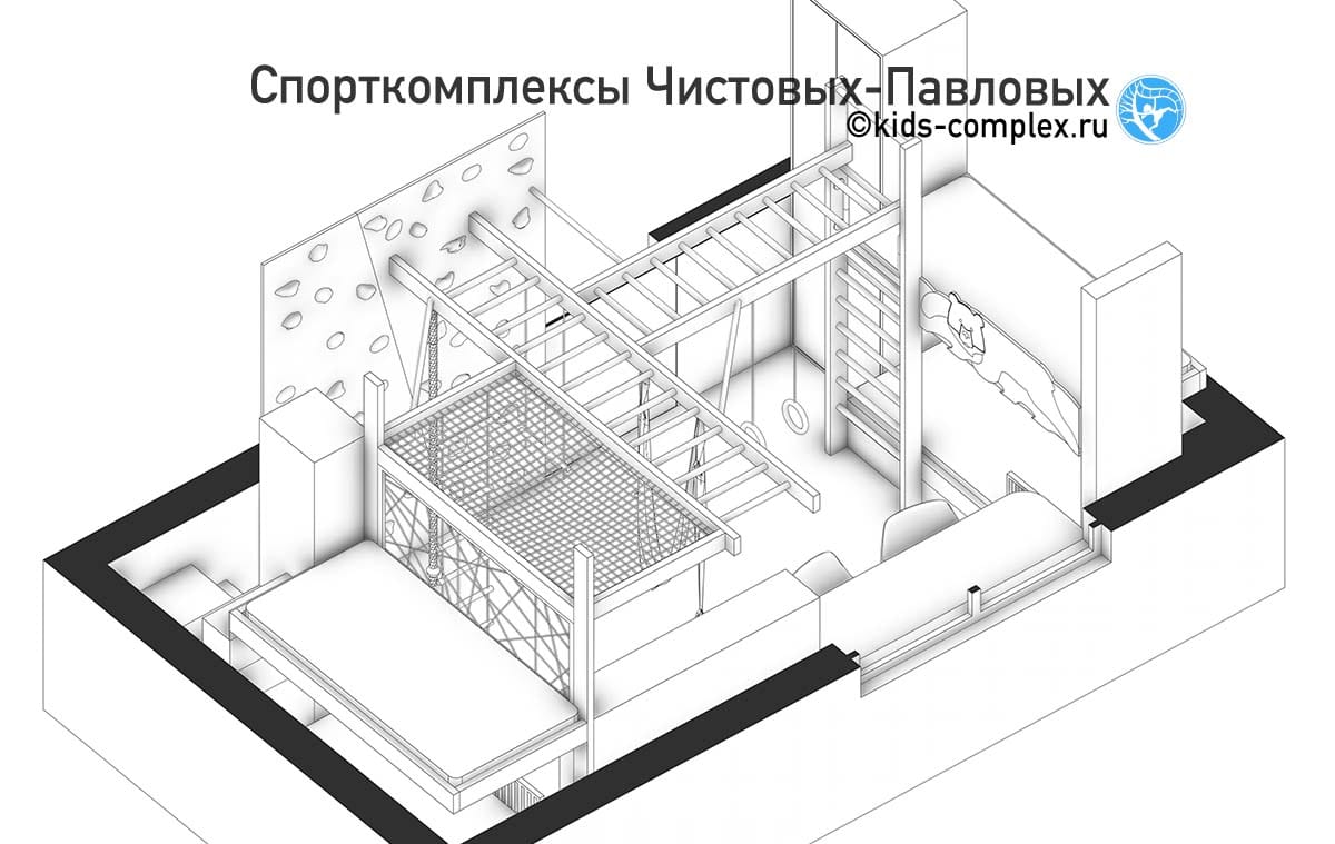 Этот комплекс начался с запроса разместить лазанье в небольшом тупике в коридоре, примерно 1600х1700 мм размером, площадью 2.72 кв.м. Мы сразу увидели неизбежную необходимость расширения. Добавив комплексу буквально полметра можно было закончить его напротив примыкающего узкого и длинного прохода, что позволяло добавить раскачивающийся снаряд и вывести лазанье из линии. Далее мы отработали много нестандартных нюансов, подробно описали их в этой статье.