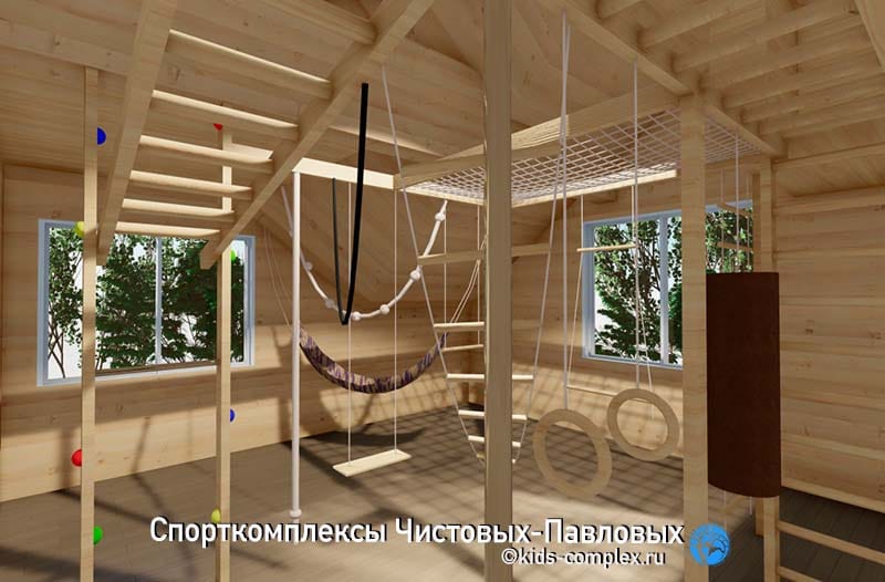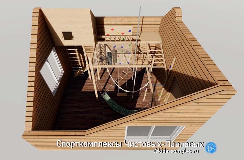 Хорошо, если площадка требует приличного отступа от потолка (больше, чем гнездо), зачем ее тогда вообще делать? В каких случаях она возникает в комплексах? Чаще всего - в мансардах. Есть особый тип помещений, которые имеют нестандартную высоту. У нас было много таких комплексов, ведь когда мы видим комнату, в которой есть зона выше трех метров (а есть мансарды, имеющие 3,5-4,5 метра в высокой части), то естественно возникает мысль о площадке или домике (иногда и площадке, и домике). И в зависимости от окружения площадка будет играть разную роль: от игровой зоны до чисто промежуточного сложного пункта высотных переходов и отдыха. Домик же - место игры и отдыха по определению. Это своего рода тайник, скрытое место. И хотя мы любим, чтобы в каждый домик вел свой "дежурный" лаз, которым, в случае необходимости, могут воспользоваться родители, все-таки домик - это место уединения. То есть это место, где фасад закрыт, где ребенок может спрятаться или забраться туда с друзьями, играть во что-то секретное и даже уснуть. И это не будет опасно (край закрыт). Там ребенок может что-то хранить, иметь тайник, что-то спрятать. Подробно об этом комплексе здесь.