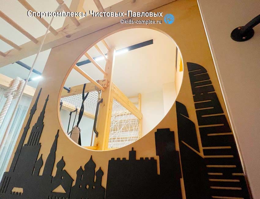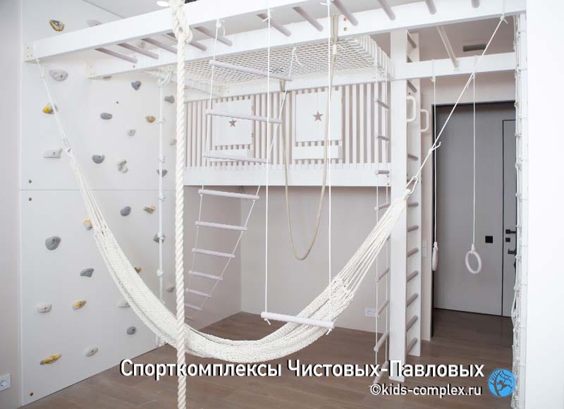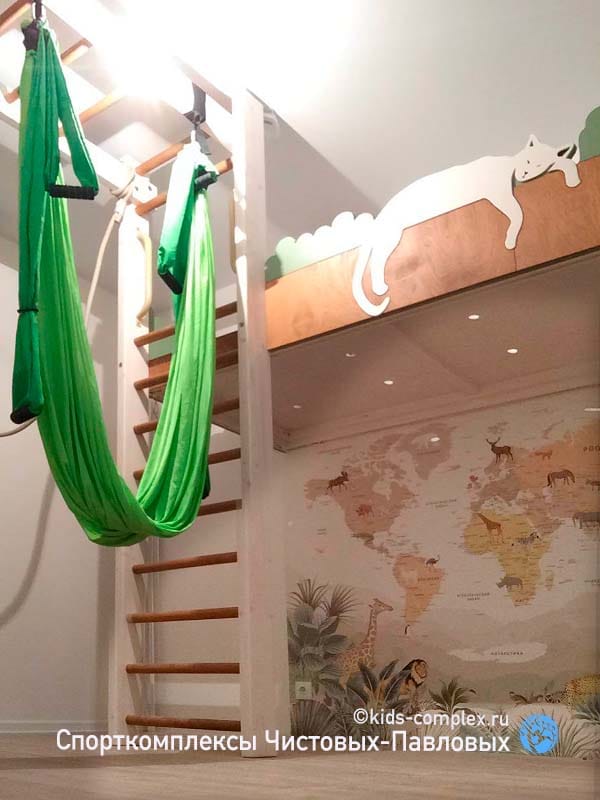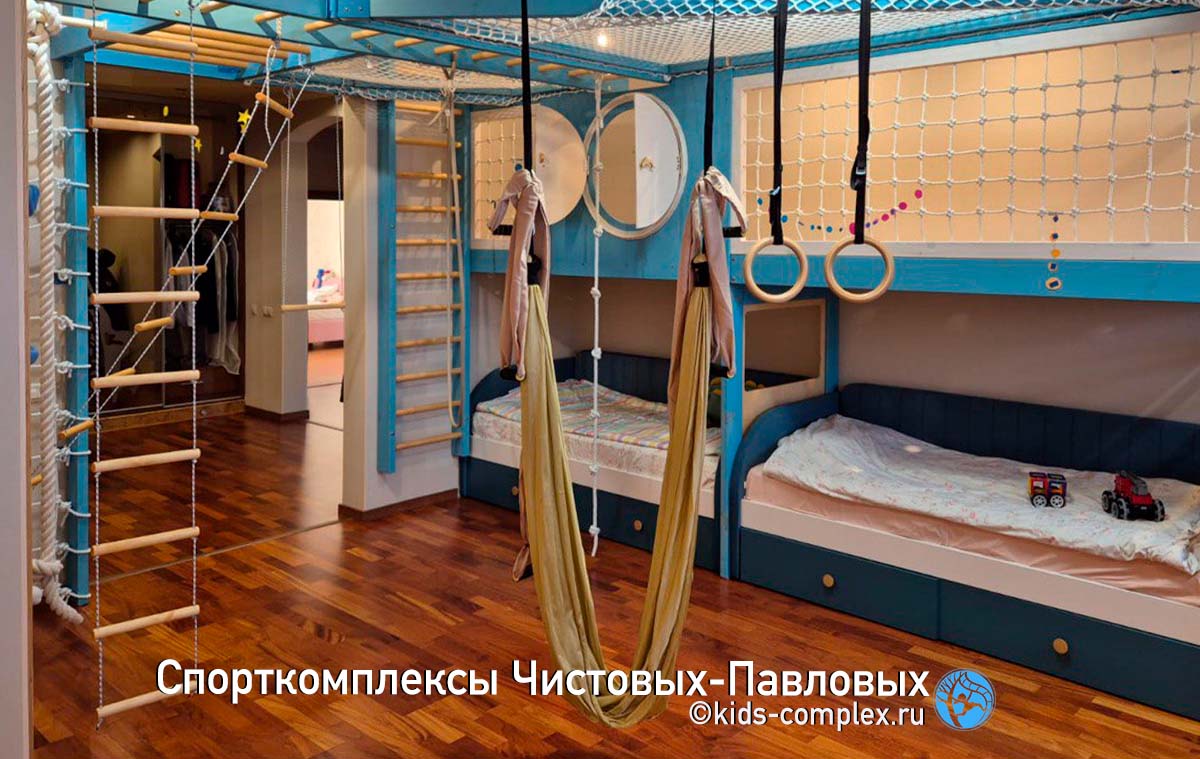 Здесь под комплекс выделена угловая зона в большой комнате. Комплекс для трех подросших детей - 7, 10 и 11 лет. Поскольку зона больше той, где хорошо встраивается прототип-1, мы предложили каркас сложней, с двумя пересекающимся рукоходами. Размер комплекса здесь примерно 3,7 х 3 метра, то есть по площади, наполнению и возможностям комплекс приближается к уличным и это очень здорово. Высота комнаты не маленькая (была на момент проектирования около 2,7 метра, но для комплекса демонтировали гипсокартоновый потолок и получилось по факту около 2,8 метра). И все-таки уличному по масштабам комплексу хотелось приличную высоту. Ведь если поднять балки под потолок, то качаться можно с большей амплитудой, а рукоходами дети смогут пользоваться весь период подрасткового и юношеского возраста. В итоге было сделано небольшое по площадки гнездо в углу. Чтобы не создавать за него конкуренцию, комплекс был укомплектован двумя гамаками - йога-гамаком с ручками и обычным лежачим гамаком. Все в целом получилось масштабно. Обратите внимание, маты комплексу как правило не нужны, достаточно мата под гнездом, который можно вытащить при необходимости.