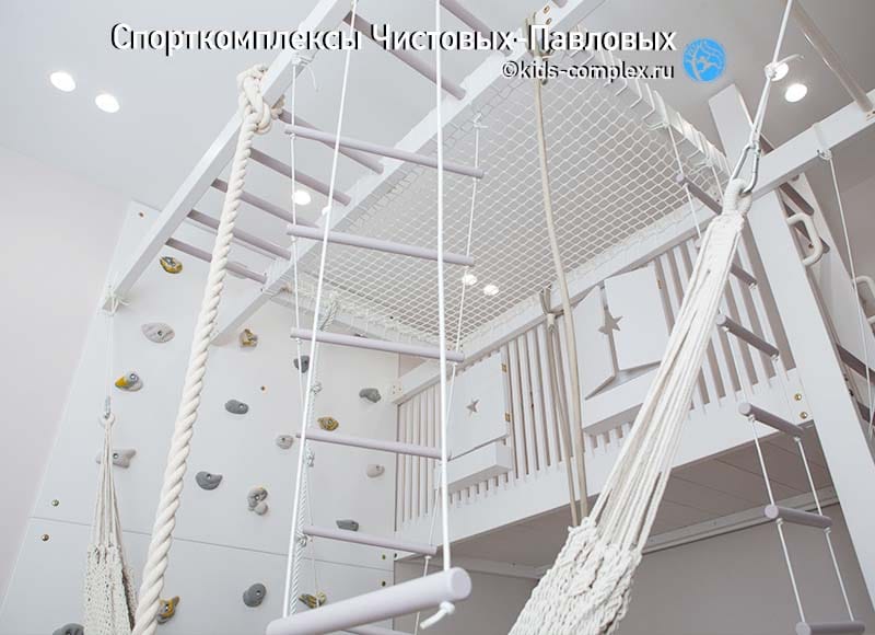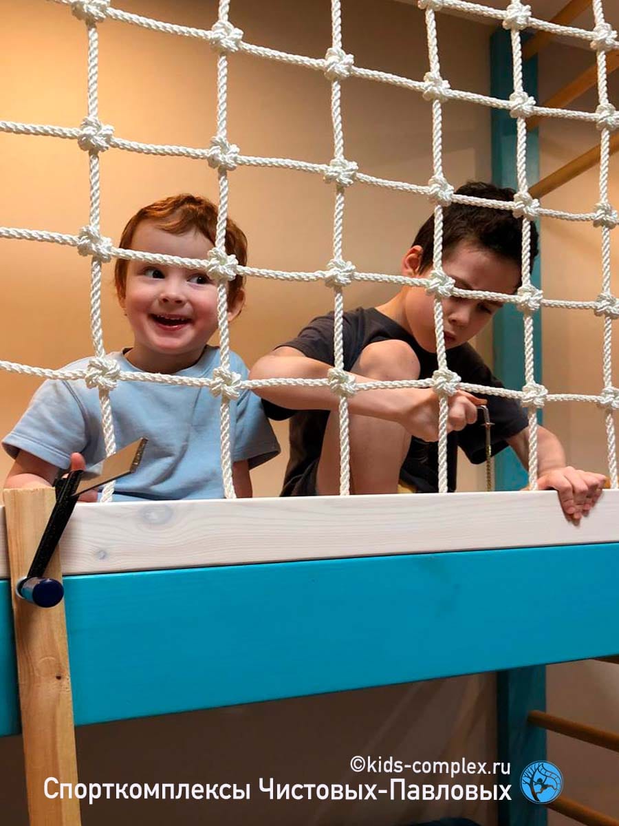 Здесь девочки 6 и 7 лет. Одна из них сидит на рукоходе (рукоход на фото установлен на уровне 2300-2420 мм от пола при высоте потолка 3000 мм), другая девочка - стоит (!) в гнезде. Когда она вылезет из гнезда, сеть вернется на место, провис в пассивном состоянии будет небольшим. По фото видно, почему не имеет смысл отступать от потолка больше. Как только мы спустимся балками ниже, мы дадим меньше возможностей раскачивания тем снарядам, которые висят на балках (лесенкам, кольцам, трапециям). Высота - это баланс интересов. Комплекс сильно лучше работает, когда в комнате потолок 2900-3000 мм, чем при высоте 2600-2700 мм. Но какая бы вам не досталось в квартире высота, именно в зоне комплекса имеет смысл ее полностью сохранить. Когда мы говорим "полностью", мы имеем в виду до сантиметра, детям потребутся каждый из них. И взрослым тоже, потому что сильно приятнее входить в комнату, если комплекс выше уровня наличника двери. Ниже наличников мы балками не рекомендуем опускатся никогда, это сломает пространство в комнате. Берегите свою высоту. Сделайте г/к короб с подсветкой, если уж так хочется, вокруг комплекса (тут на фото так и сделано, это видно). Оставьте в зоне лазанья штукатурку и бетонный потолок. Это - совет для тех, кто в теме.