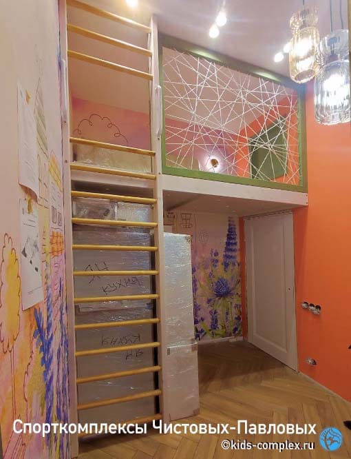 Сам по себе домик и кроватка тоже задумывались в составе спальной зоны-трансформера. Чтобы снизу при желании можно было поставить кровать и шкаф, две кровати или шкаф и зону отдыха (кресло и полки). Все это довольно просто меняется по ходу жизни. Комплекс же с поперечным рукоходом, большим скалодромом в нише и гнездом сделан вокруг кроватки, чтобы дети могли вылазить из кровати в гнездо и переходить разными транзитными путями сверху вниз и обратно. Домик тоже подключен к комплексу через короткий рукоход с подъемом и снаряды, приходящие к нему, а также смежную шведскую стенку. Основной переход в домик - через кровать, куда можно попасть, открыв себе для этого дверцу.