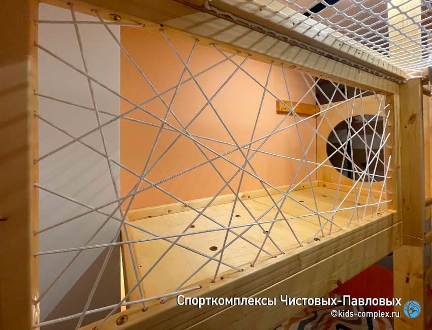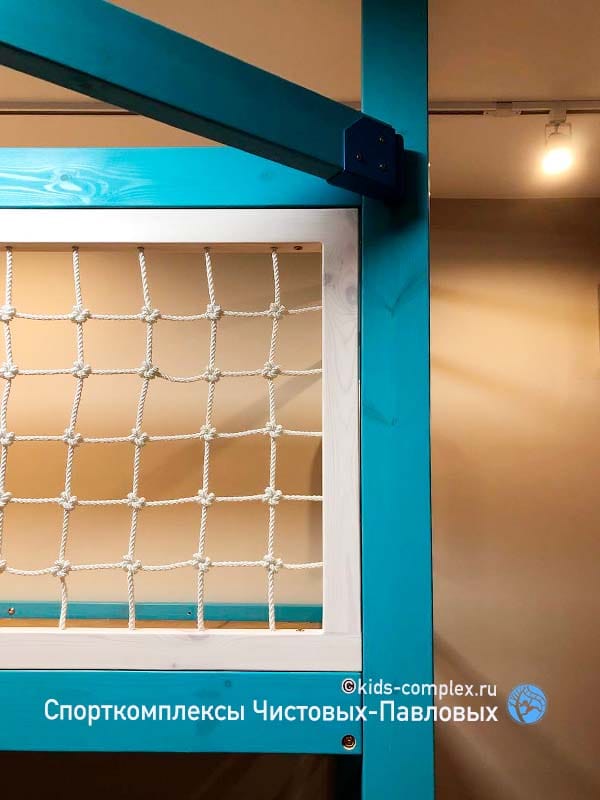 Наиболее распространены в качестве огрождений домиков сети трех типов. Первый тип, простая безузелковая сеть. Она наиболее воздушна и прозрачна, делается в тех случаях, если домик не граничит с системой лазанья и по сети не нужно будет лазить. Второй тип - сеть-паутинка. Она вяжется по раме в размер домика, создает внешне хаотичную систему. Может быть двух или трех цветной. Не предполагает лазанья (устанавливается на антресолях или в домиках, которые граничах с комплексом с одного торца). Наконец, сеть с узелками, аналогичная по толщине и плетению гладиаторской сети (канат 10 мм) предполагет лазанье (здесь - три центральных фото, голубой комплекс с белой рамой). Оптимальна на границах с комплексом и гнездами, на нее можно наступать, использовать в качестве ступеньки.