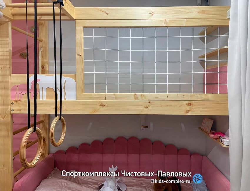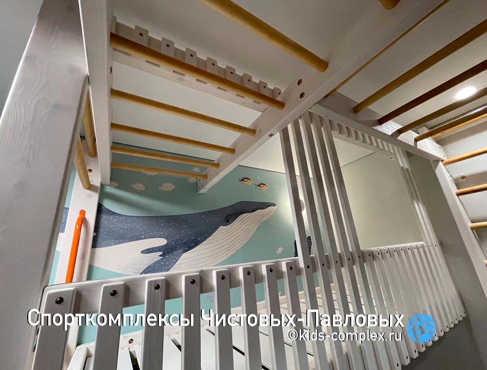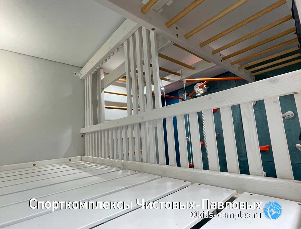 Но домик с фасадом решили сделать закрытым только в сторону входной двери. На комнату смотрит открытая его сторона с простым спортивным ограждением, откуда много разных путей на комплекс (на скалодром, в гнездо и на навесные снаряды). Родители захотели сделать так, чтобы у мальчика на втором этаже было много света и воздуха. Комната в целом оформлена горами, скалодром и каркасы кроватей сделаны в виде мозаики "Горы" и определяют интерьер комнаты. Комплекс получился живой, красивый и живописный.