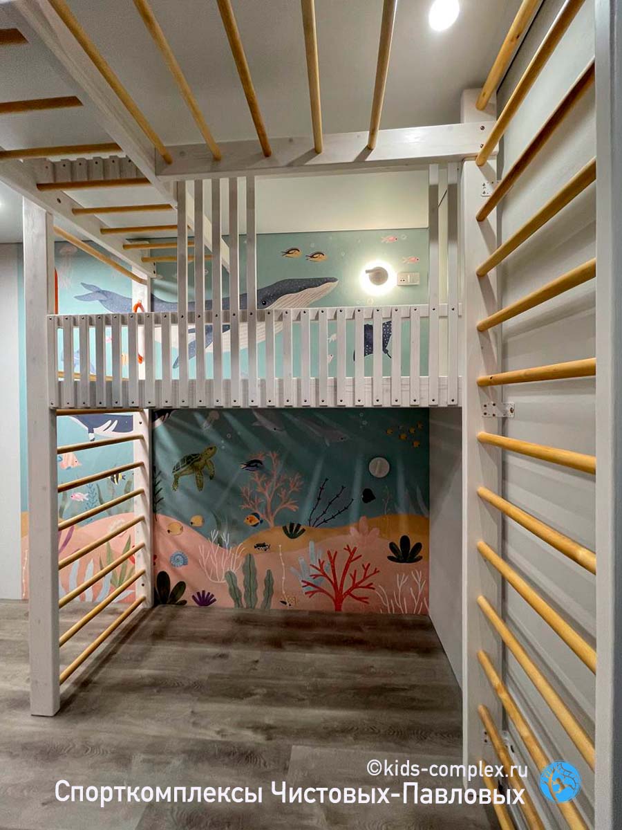 На этом примере давайте разберемся,чем гнездо отличается от площадки для игр в спортивном комлексе. Здесь заказчики захотели встроить в комплекс шкаф, и все бы хорошо, но они люди очень рациональные. Зачем, сказали они нашей маленькой девочке высокий большой шкаф (ей было на тот момент лет пять-шесть). У нее нет, да и не будет так много вещей. Давайте сделаем шкаф 1800 мм, этого ей достаточно. Ну хорошо, давайте, только что будет сверху? Ведь если такой шкаф рядом с комплексом, то ребенок обязательно будет на него залазить! Ну и пусть, в принципе, залазит, может ей вообще домик там сделать, играла бы в нем! Вот такой диалог произошел у нас с заказчиками. А дальше мы напряглись. Потому что мы представили себе тупиковый домик в размерах шкафа (а это всего 600 мм), в который в один прекрасный день ребенок залез и застрял. Ведь это сейчас она такая маленькая? Поняли суть проблемы? Домик делают с запасом, чтобы в него (в случае надобности) мог поместиться даже взрослый. Это хотя бы 1000 х 1000 мм., ну можно 1500 х 900 мм., Но никак не 1200х600 мм., так нельзя. Это не коробочка, чтобы в случае паники ее разорвать. Нужно, чтобы любое застревание было абсолютно исключено. Площадка - открытая. Она не может вызывать, она может быть меньше. Главное продумать, как с нее не упасть. Поскольку она жесткая, провиса не имеет, то должно быть ограждение, бортик, граница с гнездом, какая-то защита края. И, конечно, высота. Площадка требует приличного отступа от потолка. Мы для себя "рабочим" отступом твердых поверхностей от потолка или крыши считаем как минимум 900 мм., а лучше 950 мм.