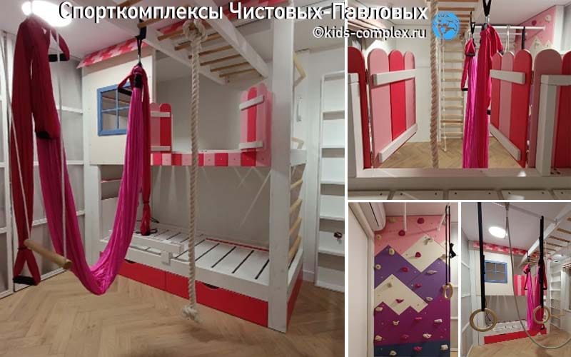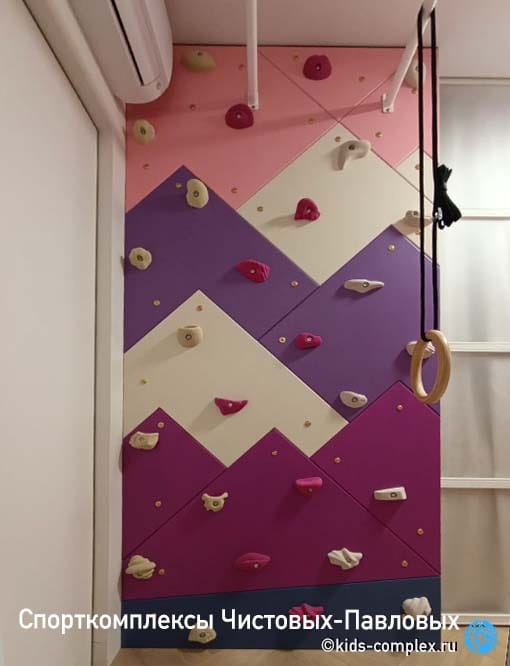 Вся интрига опять создана за счет поперечного рукохода. Но вы видите, что даже в этом случае в проход может качаться не больше одного снаряда. Скалодром и шведская стенка работают здесь в связке, но на самом деле все соединяют в единой целое длинные диагональные турники. На которые не только можно повесить несколько раскачивающихся снарядов, но и переместиться из одной части комнаты в другую под потолком "обезъяним" хватом. Эти турники также формируют диагональ, к которой можно присести лесенку Скрипалева. Из навесных снарядов тут хорошо работает трапеция, кольца, лесенка Скрипалева, лиана и канат. Тут даже могут поместиться навесные брусья и приставная горка. И обратите внимание, какой тут большой интересный скалодром (ему ни мало не мешает, что он стартует из-за матраса).
