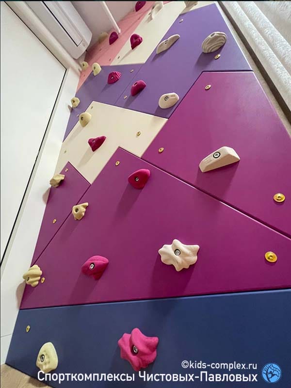 Отдельно хочется рассказать про цвета этого проекта. Малышка любит розовый и радугу, а родителям понравился сюжет скалодрома "Горы". Что делать, горы розовыми не бывают? "Почему же не бывают", - сказали мы и подкинули заказчику десяток разных картин Рериха. Одна из них идеально подошла по цвету (верхний ряд слева), вторая - была взята как основа для композиции, потому что скалодром в простенке имеет вытянутую вертикальную форму (2610х1200 мм). Если вы думаете, что Рерих - фантазер, поезжайте в Гималаи (нижний ряд слева). Итог раскладки цветов на скалодром-мозаику получился очень гармоничным (верхний ряд справа). Эти же цвета легли в основу других частей комплекса. Так люди, не ограничивающие фантазию ребенка, приходят к необычным цветовым решениям.