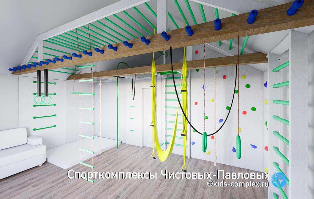 Самый спортивный вариант - сделать высокий рукоход под коньком крыши, при удачном сочетании высот он его можно прикрепить к лагам крыши. Если они зашиты стена-стена. Под рукоход в любом из четырех углов (в зависимости от другой мебели) поставить стойку, от нее построить гнездо в низкую часть под скат. Гнездом можно будет пользоваться с ограничениями, зато рукоход (а его имеет смысл делать максимально широким) позволит навесить множество снарядов с отличной амплитудой раскачивания.
