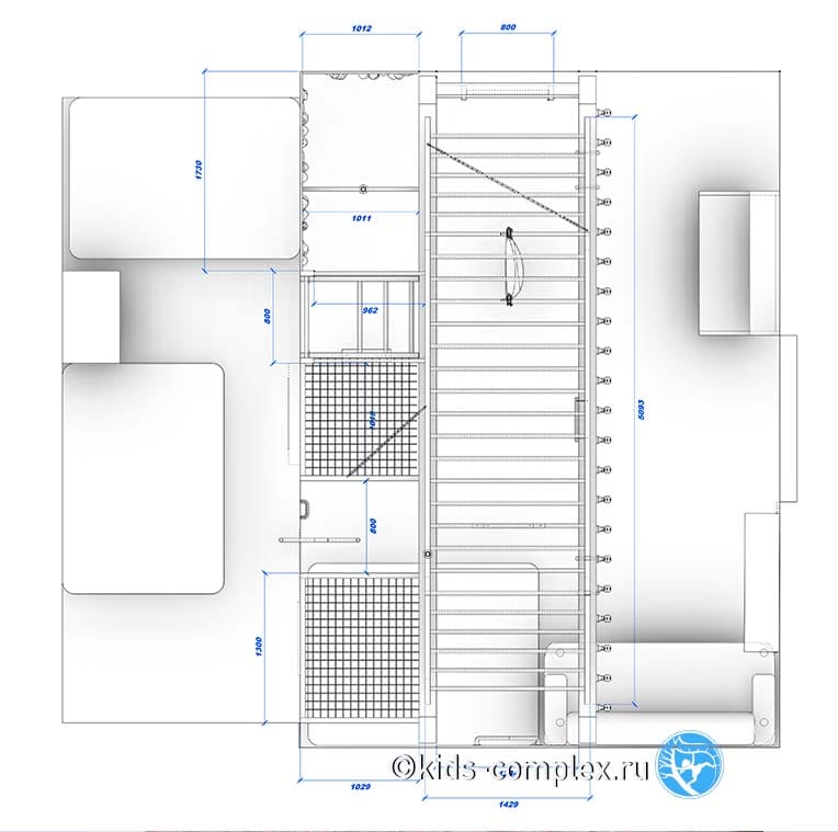 Мы решили стоить комплекс под строительными лагами (в основе комплекса лежит модель поперечного рукохода), а над лагами надстраивать домик, имеющий закрытую и открытую часть. Чтобы домик был тесно интегрирован в систему лазанья продумали в него лазы с каждой из свободных сторон (их три), непосредственно к домику пристыковали гнездо, находящееся на высоте нижнего края горизонтальных лазов. Под комплексом и в свободной части комната у окна расположили две кровати. Тут поместились и гамаки и все основые снаряды для лазанья, и в комнате также осталось достаточно свободного места в светлой зоне у окна, чтобы организовать зону для учебы и других занятий. В этом комплексе много мелких изюминок и тщательно продуманных деталей - расположение лазов, прямые и наклонные фрагменты скалодромов, переходы в верхнем контуре, основанные на точно рассчитанных интервалах между снарядами. Очень важно в таких случаях точно воплотить комплекс по проекту, поскольку любые отклонения могут изолировать тот или иной снаряд и разбалансировать систему.