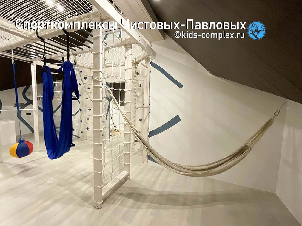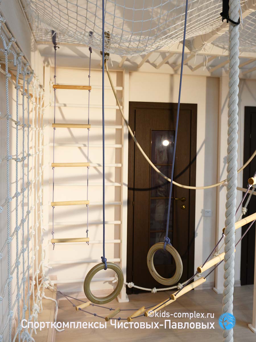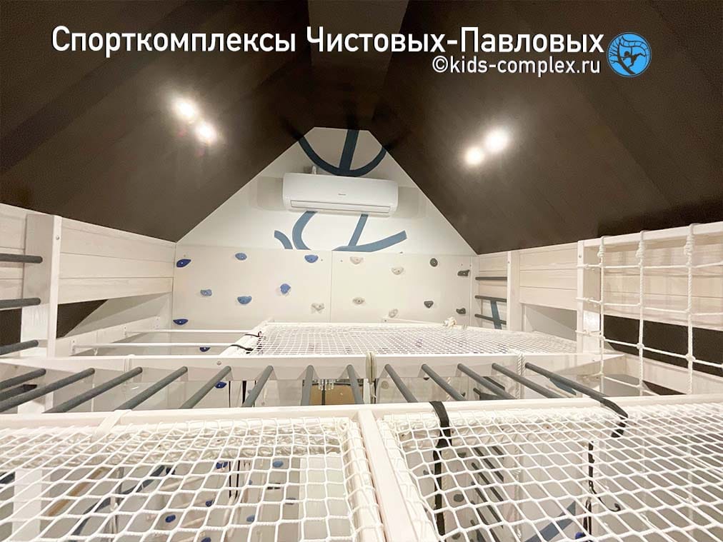 В данном случае в мансарде кроме козырька были несущие столбы, обшитые деревом, комплекс сделали в их стиле. Комплекс потребовал несколько дополнительных стоек, которые привязывались к лагам крыши (проектирование осуществлялось на черновом этапе). Чтобы изолировать комплекс от проема и полностью исключить возможность "улететь" туда, вдоль проема были поставлены шведская стенка и гладиаторская сеть. Внешний корнур комплекса имел достаточную высоту и удаление от стен, чтобы навесить самые амплитудные из навесных снарядов. Были тщательно продуманы многочисленные лазы в гнезда, чтобы максимально интегрировать их в комплекс. Комплекс получился масштабным, допускающим одновременное лазанье группы детей.