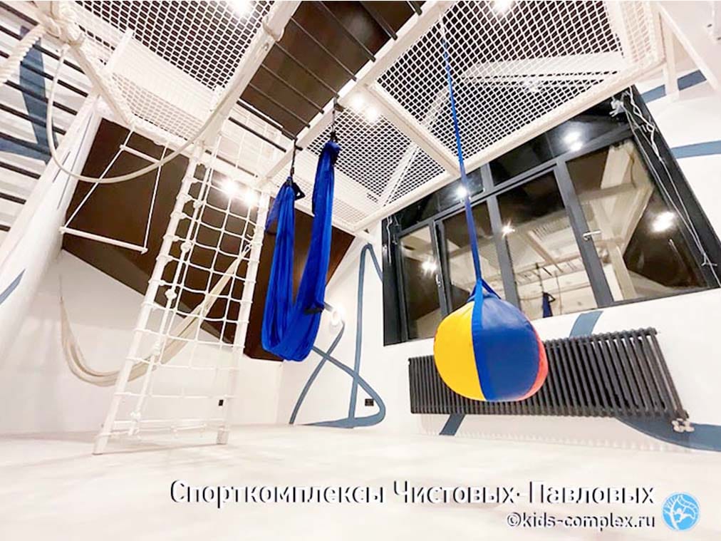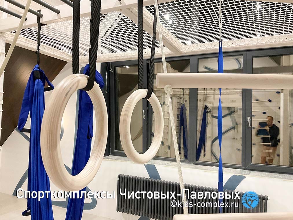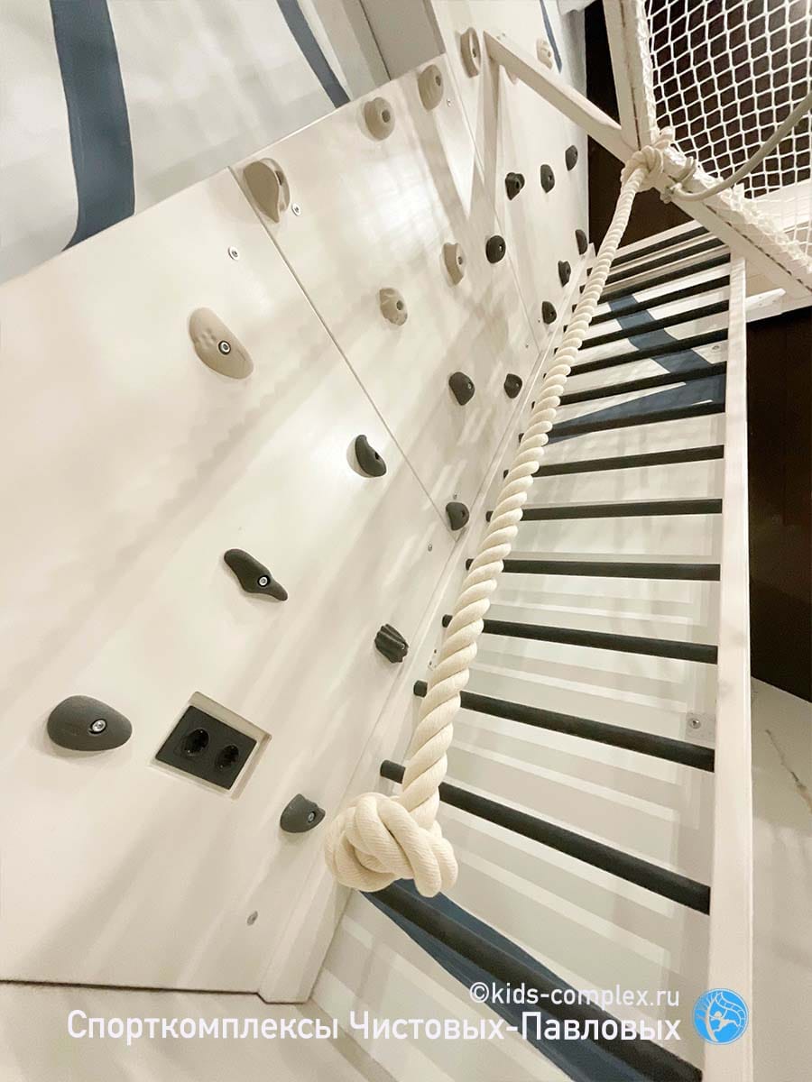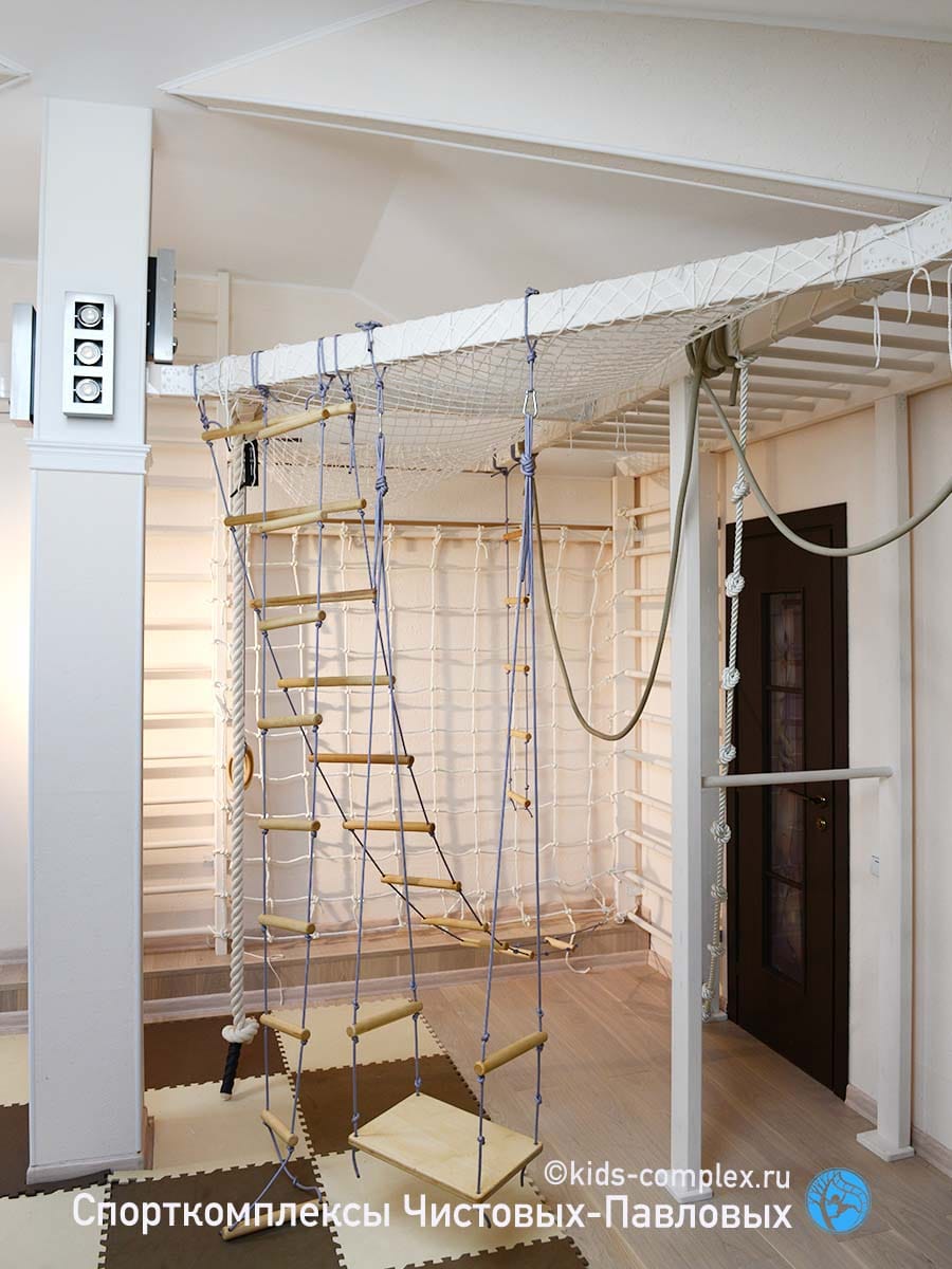 В данном случае в мансарде кроме козырька были несущие столбы, обшитые деревом, комплекс сделали в их стиле. Комплекс потребовал несколько дополнительных стоек, которые привязывались к лагам крыши (проектирование осуществлялось на черновом этапе). Чтобы изолировать комплекс от проема и полностью исключить возможность "улететь" туда, вдоль проема были поставлены шведская стенка и гладиаторская сеть. Внешний корнур комплекса имел достаточную высоту и удаление от стен, чтобы навесить самые амплитудные из навесных снарядов. Были тщательно продуманы многочисленные лазы в гнезда, чтобы максимально интегрировать их в комплекс. Комплекс получился масштабным, допускающим одновременное лазанье группы детей.