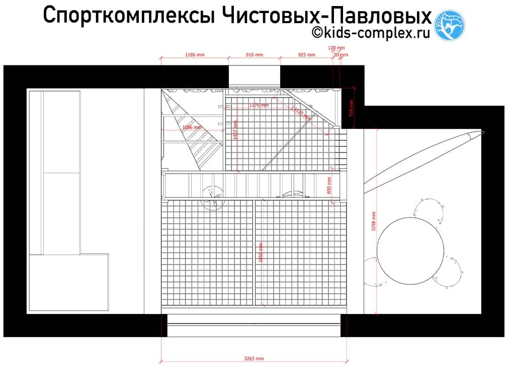План следующего комплекса четко созрел в голове у нашего заказчика к тому моменту, когда он обратился к нам. Он видел комплекс как длинный рукоход, расположенный над дверями. Это большая мансарда, размером 8250 на 8300 мм, с большим перепадом высот от 3300 мм в самой высокой части до 83 мм в самой низкой части. Под комплекс была отведена самая высокая часть комнаты, но в ней находились три двери в кладовки, открывающиеся наружу (не являющиеся проходными).