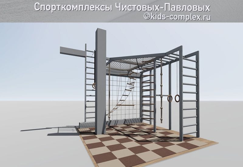 В этой мансарде есть несущая колонна и несколько несущих балок, уходящих под разными углами к общему своду, но не сходящихся внутри комнаты. Нижняя часть комнаты отведена под зону отдыха, в высокой же планировалось проводить тренировки по йоге, поэтому она должна была быть максимально свободной. Детей в семье четверо, в возрасте от 4,5 до 12 лет, их отец также планировал использовать некоторые снаряды комплекса. Мы настояли на том, что комплекс нужно вывести из линии, чтобы иметь возможность навесить на него раскачивающиеся снаряды. Комплекс получился струкруно немного похож на прототип-1 с корректировками на возможность креплений (к столбу и несущим балкам).