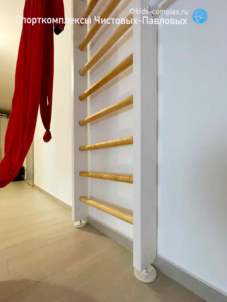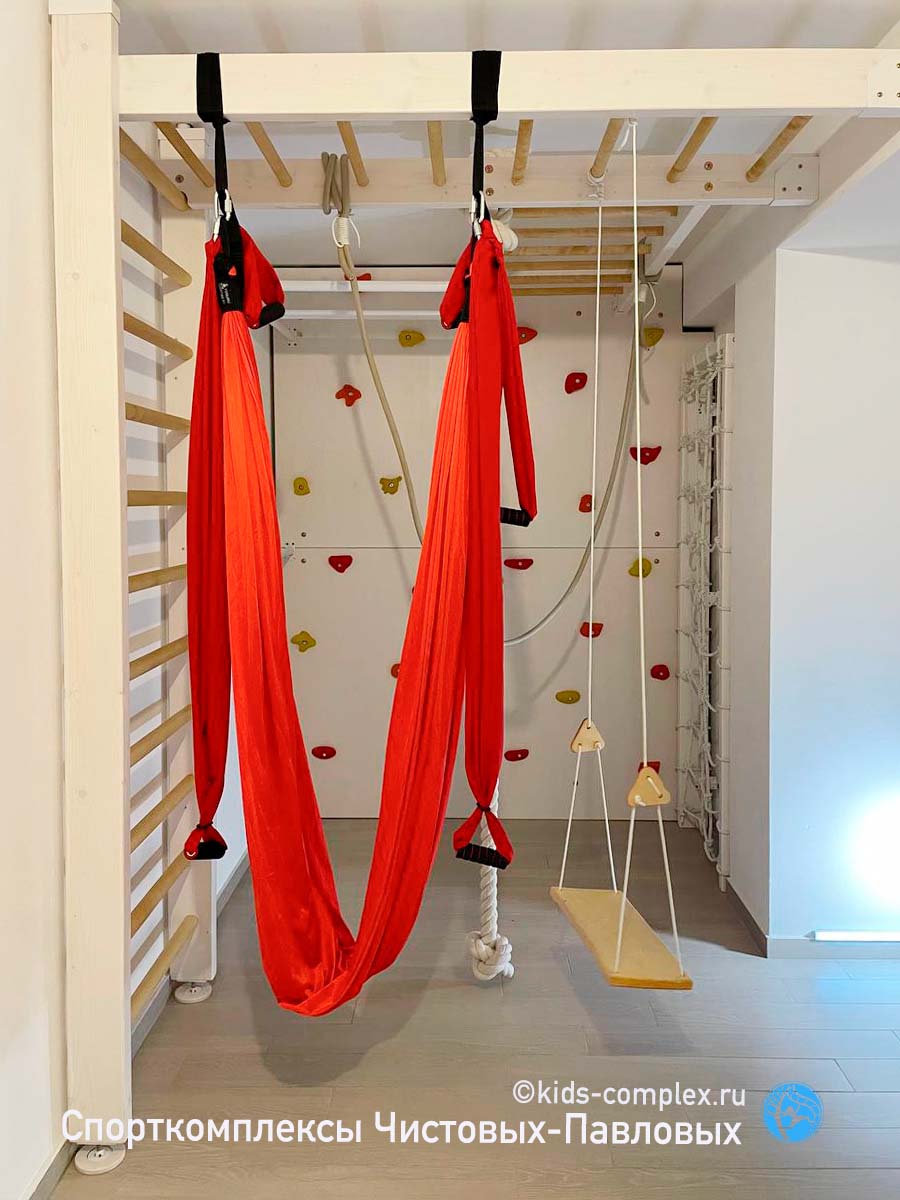 В отличие от шкафов ниши спортивному комплексу помогают мало. Если ниша плоская (всего 150 мм как здесь), то мы помещаем в нее какой-нибудь из пристенных снарядов. Понимая, что если ниша срезана по высоте, то и снаряд будет работать с ограничениями. Если бы ниша была глубокая, тут можно было бы разместить стеллаж для хранения и он не мешал бы лазанью. Обратите внимание, из основных пристенных снарядов - скалодрома, шведской стенки и гладиаторской сети - мы выбрали для ниши последнюю Чтобы не ограничивать функциональность двух первых. Есть и плюс. Стойки гладиаторской сети спрятались и не будут источником столкновений. Все в дом!