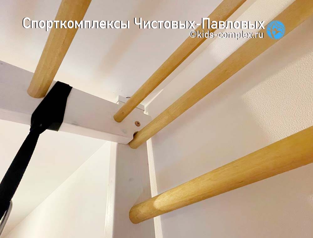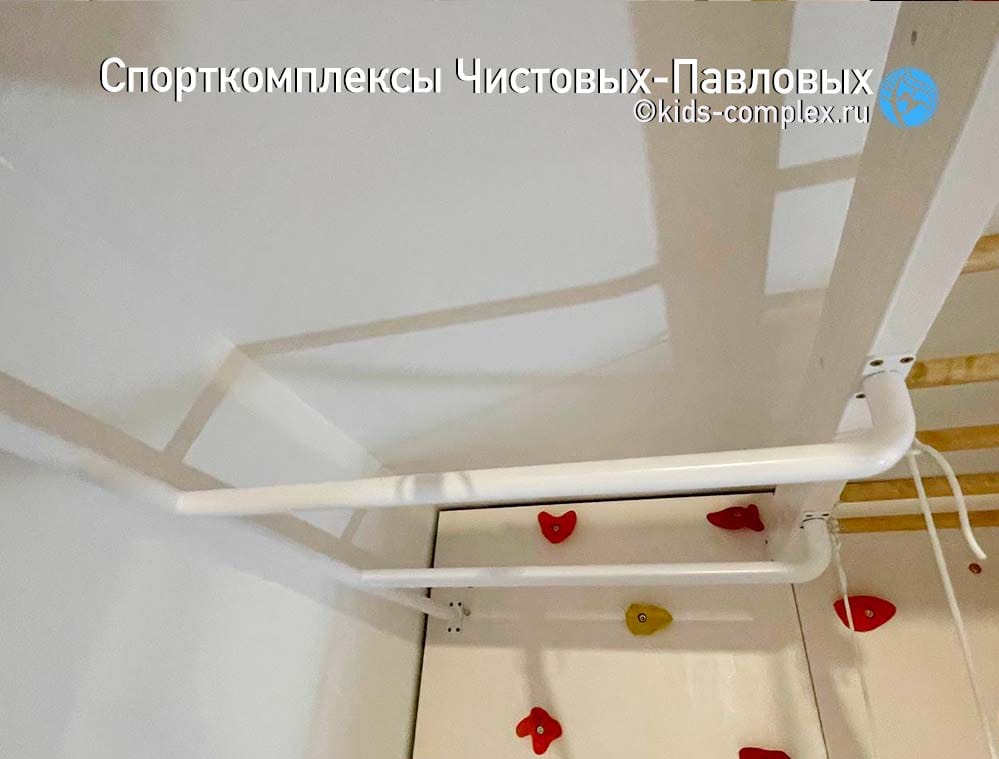 Здесь есть две хитрости, которые существенно улучшат лазанье и которые вы не поймешь с нуля, если не наблюдаешь детское лазанье год за годом. Что нужно было разместить в простенке между шведской стенкой и рукоходом? Вариантов несколько. Можно было пегборд, он довольно плоский, но это снаряд для продвинутых. А для начинающих? Сделаем систему турников. Вдоль стены два горизонтальных турника на разных высотах. Конечно, на них не кувыркнешься (для этого нужно установить турник в проем и мы работаем над такой связкой). Но на них можно делать много всего другого. Переходить со снаряда на снаряд по стене, вывешиваться (умеючи - даже вниз головой) и использовать их как танцевальный станок. Верхние турники - для подтягиваний. Поскольку потолок в квартире низкий и рукоходы подняты максимально вверх, чтобы сохранить высоту лазанья, турники для подтягиваний слегка снижены. И вот получилась нестандартная, но функциональная подсистема.