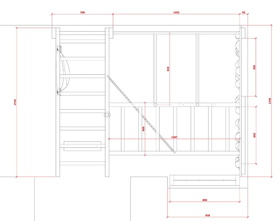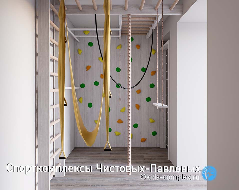 Если мы имеем дело с детьми, особенно маленькими (до подросткового возраста) главный акцент всегда на том, что раскачивается. Лучшее место для йога-гамака. Йога-гамак - царь детских спортивных комплексов. Ему нужно +/- 2 метра свободными вперед и назад. И если в комнате мы идем иногда на компромиссы и сокращаем это расстояние до 1,5 метров, то в коридоре - нет. Именно 2 метра. Чтобы ребенок летал свободно до полусолнца. Прицип сохранения гармонии простой - забрали что-то (в данном случае - объем), сохраните амплитуду и высоту. Второй амплитудный снаряд здесь - качель и третий, работающий с ограничениями - трапеция (поперек коридора 1,7 м., вспомогательный снаряд). Не обязательно расставить именно такие акценты. Можно дать больше свободны трапеции, а качель убрать, с ограничением навесить кольца. Но нужно хотя бы два снаряда, которые будут работать без компромиссов. И еще что-то в качестве связки и что-то, работающее по диагонали. Здесь - канат и лиана. Обратите внимание, что снаряды по стенам сделаны максимально плоско. Идеальны для таких случаев скалодромы, пегборды, скалолазные полочки и фингерборды по периметру. Что-то, не забирающее объем. Шведская стенка одна, чуть в стороне. Она "дорогая" для ширины коридора - требует аж 150 мм. В этом коридоре мы можем себе это позволить, он 1,7 метров. В других может оказаться тесно, тогда ее место должно считаться так, чтобы не мешать йога-гамаку.