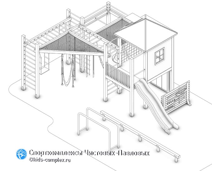 А дети лазить любят и любят играть, используя домики. Что же делать? Если мы проведем анализ рынка и посмотрим на то, что продают в России в сегменте игровых уличных площадок, это может разочаровать взыскательный взгляд. С домиками здесь все более-менее нормально, но в спортивных целях ни одно из этих готовых решений не годится. Почему? Это отдельный разговор, возможно мы разойдемся на критический обзор в будущем, сейчас же скажем главное: большинство готовых детских уличных игровых площадок с домиками строго линейны, то есть со спортивной точки зрения совершенно пусты. Этим не исчерпывается большой список их недостатков. Еще одним является строгое позиционирование. Если это детская уличная игровая площадка, то она утыкана столбами, акцентирует только качели и горки, имеет немножко антивандальных сетей и беспомощных наклонных склодромов и, конечно, она обычно слишком низкая (2200 мм - это приемлемо для дома, но не для улицы). Если взрослая - диаметры снарядов крайне не удобны ребенку, навесное оборудование отсутствует. Ни а какой системности говорить не приходится. Тем более о том, чтобы на одной и той же площадке играл малыш и занимался папа. А тем более, играл малыш с друзьями и занимался папа с друзьями.