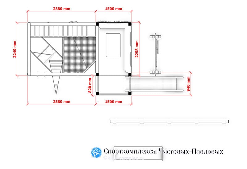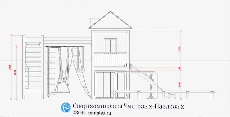 Этот проект был сделан для русских малышей- близнецов, живущих на Кипре. И впервые был построен именно там. Мы взяли за основу универсальный пиломатериал (клееный брус 120х120 мм), который доступен нам и который мы несколько лет регулярно используем. В качестве основы этого комплекса с домиком был взят один из наших любимых проектов - треугольный комплекс для Барнаула. Его зона с высоким скалдоромом легко "расшаивалась" до домика. И - главное! - скалодром не потерян, он просто перенесен на дальнюю сторону домика. Тыльная сторона домика - скалодром. Внутри домика на первом этаже может быть организована песочница. Рядом со скалодромом внутри домика - хранение инвентаря для сенсорной зоны. Два любимых детьми снаряда, не интегрирующихся в систему лазанья - бревно и брусья - вынесены в отдельную зону рядом. На рисунках видны принципиальные габариты зоны лазанья и зоны домика. Возможна сокращенная модификация (треугольник плюс домик-башека без дополнительного гнезда). В этом случае третья стенка домика закрывается или обрастает дополнительным скалодромом (но может остаться и открытой с гладиаторской сетью как сейчас). Каркас высоко вариативен в своих опциях. Из новых элементов - горка, бревно, брусья, сенсорная зона для малышей. Подробности про сенсорную зону моно почитать здесь. Вишенка на торте - окошко в крыше домика, его хорошо видно на последней картинке. Как у нас и бывает: здесь хорошо виден каждый лаз и совершенство - в деталях!